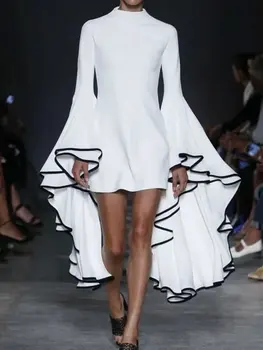 Yeezzi Women Fashion Elegant Flared Sleeves Party Evening Mini Dresses 2024 New Autumn Stand Collar Slim Fit White A-line Dress