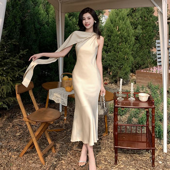 Ribbon Halter Dress Woman Elegant Off Shoulder Satin Long Dress Women Backless Sexy Evening Dresses Summer Party Dresses Women