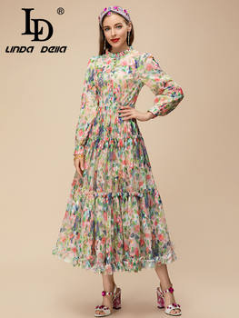 LD LINDA DELLA Summer Runway Fashion Dresses Women’s Bohemian Floral Print Net Yarn Temperament Sexy Ruffles Dresses Sizes S-4XL