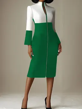 Modigirl Women’s Bodycon Dresses 2024 Autumn Winter Contrast Color V-neck with Zipper Long Sleeves Formal Occasion Dresses