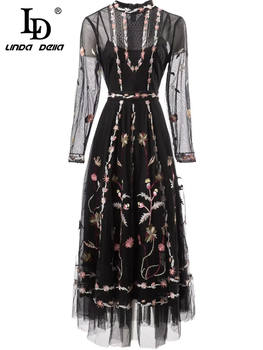 LD LINDA DELLA Fashion Designer Summer Dress Women Flare sleeve Pink Vintage Flower Embroidery Mesh Party Midi Dresses