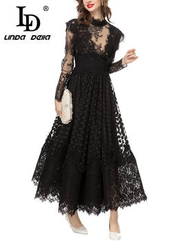 LD LINDA DELLA Summer Style Birthday Dress For Women Black Transparent Round Neck Splice Print Elastic Waist Lace Long Dress