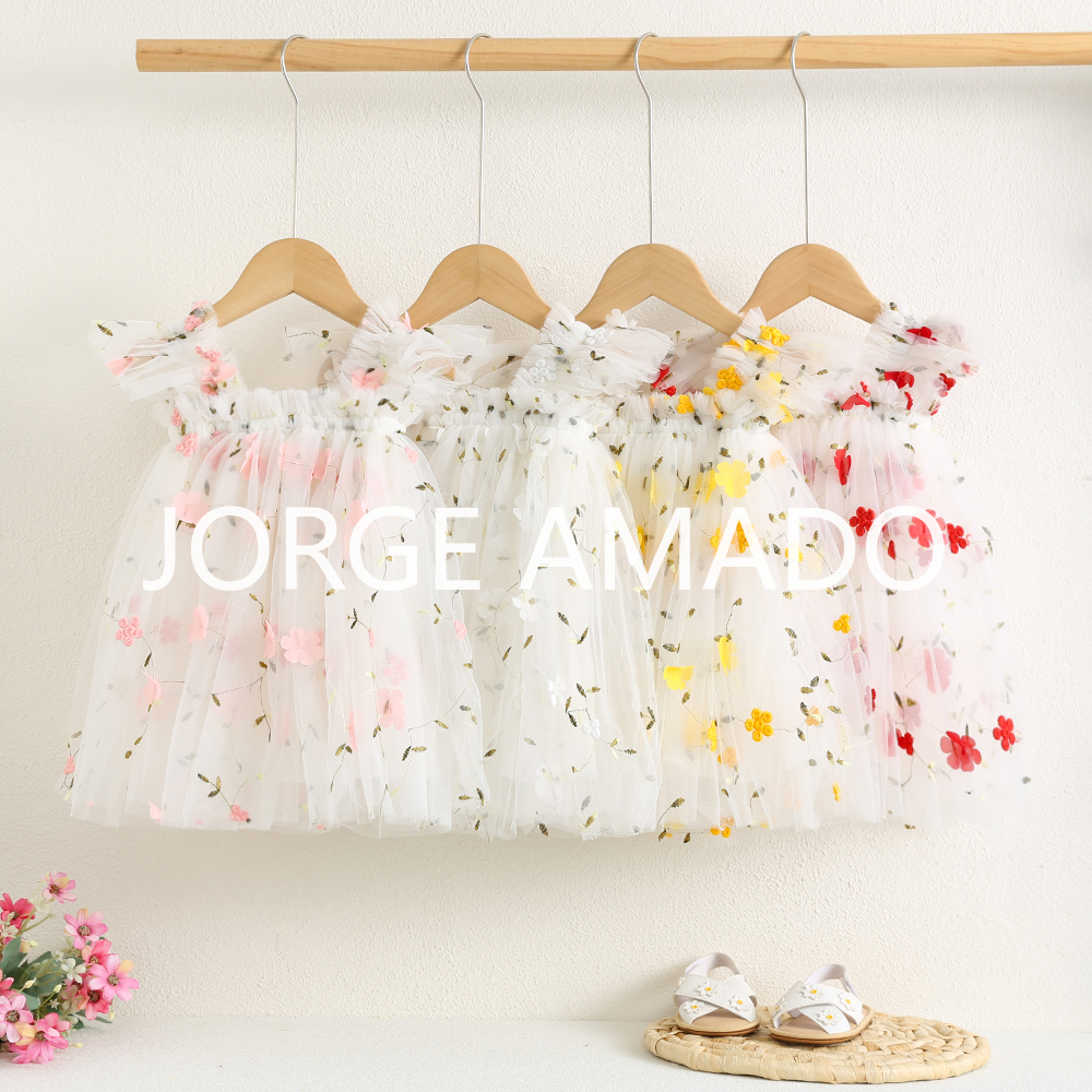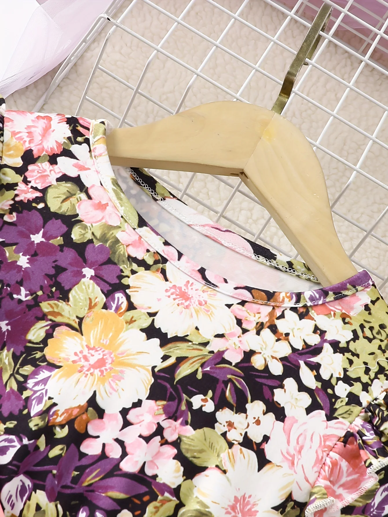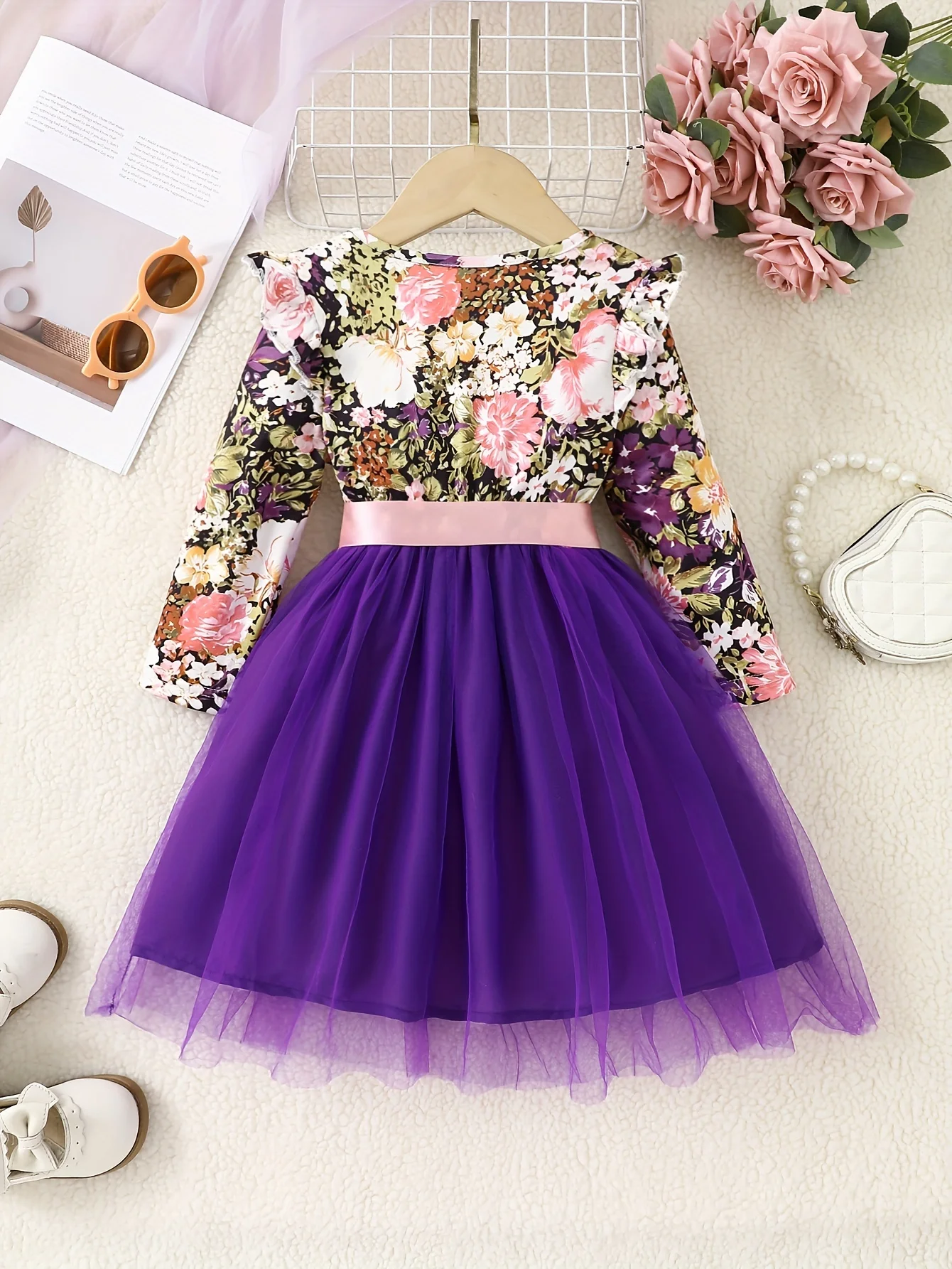 Girls’ Knitted Round Neck Long Sleeve Floral Print Mesh Dress Party Princess Dress