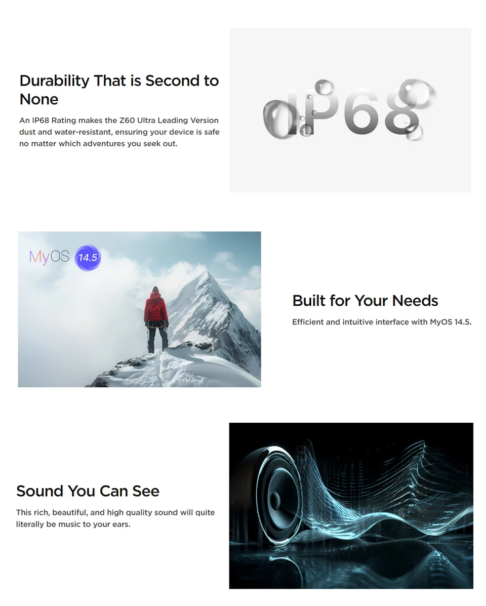 In the box: z60 ultra Leading Version*1,Power Charger *1,Type C Cable *1,Case *1,SIM Card Tool *1,Quick Start Guide *1,Warranty Card *1
