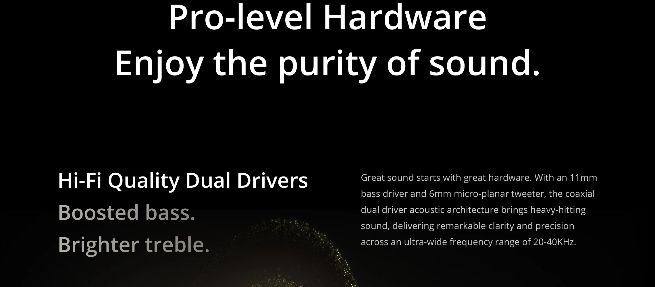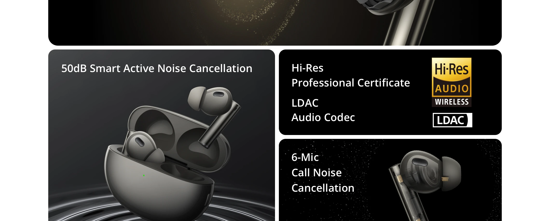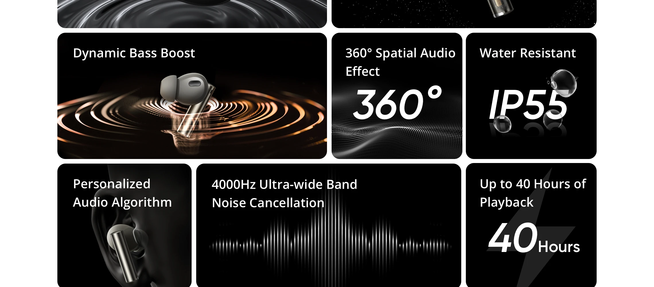 Hi-Fi Quality Dual Drivers/50dB Smart Active Noise Cancellation/360° Spatial Audio Effect/Up to 40 hours of Playback(10 mins Charge for 7 hrs Playback.)/6mm Micro-planar Tweeter/11mm Bass Driver/Personalized Audio Algorithm/Certified by Hi-Res LDAC Transmission/Dynamic Bass Boost/4000Hz Ultra-wide Band Noise Cancellation/Smart Adaptive Noise Cancellation/6-Mic Call Noise Cancellation/55ms Super Low Latency/Dual-device Connection 2.0/Mindflow mode/Google Fast Pair/Smart Touch Controls/IP55 WaterResistance