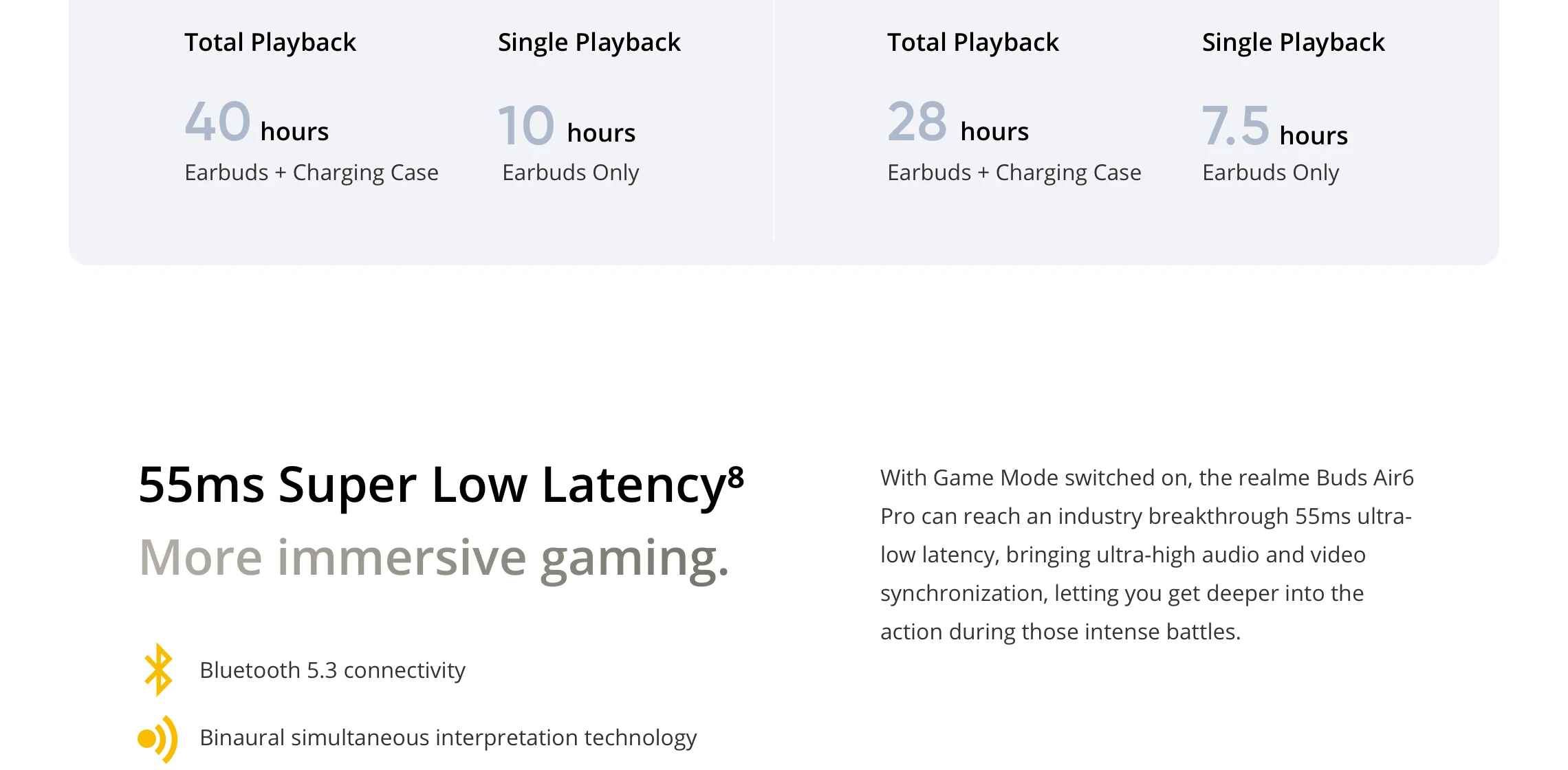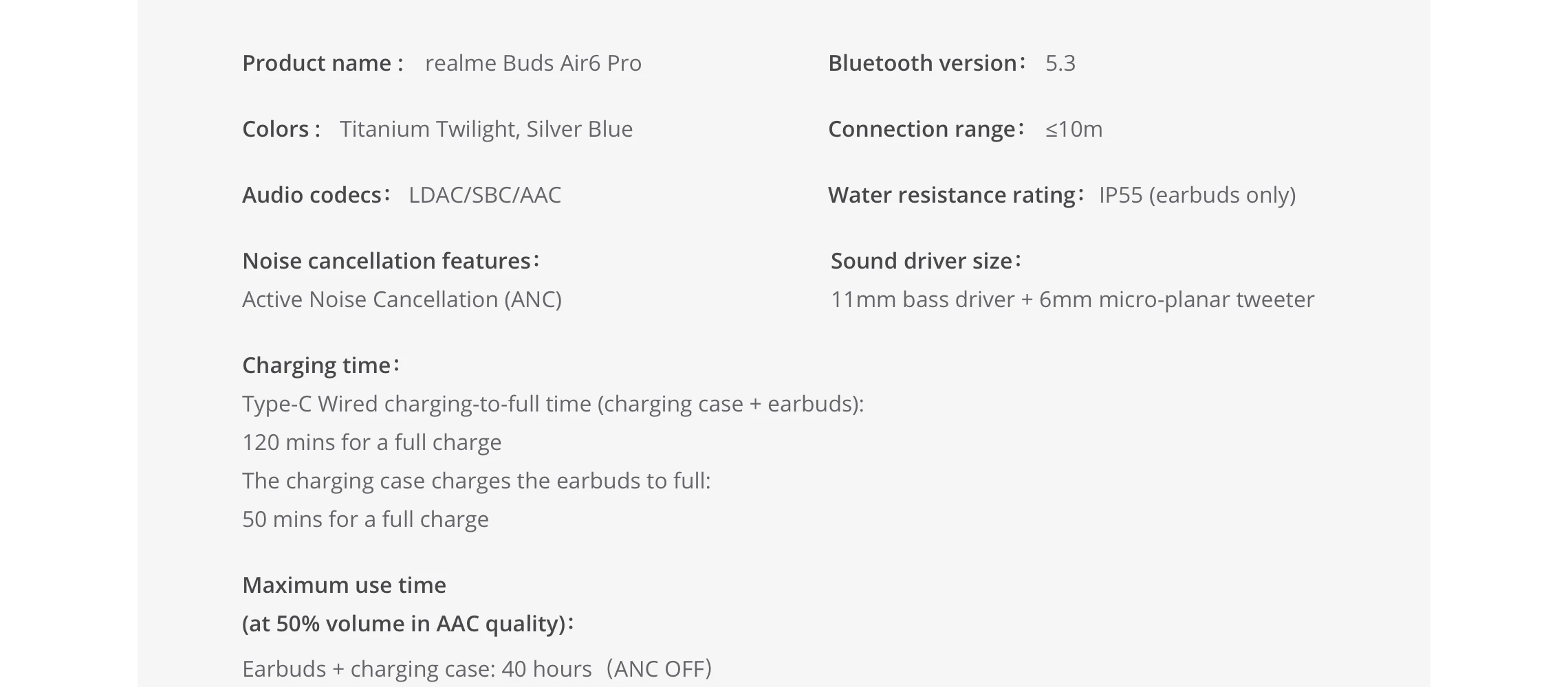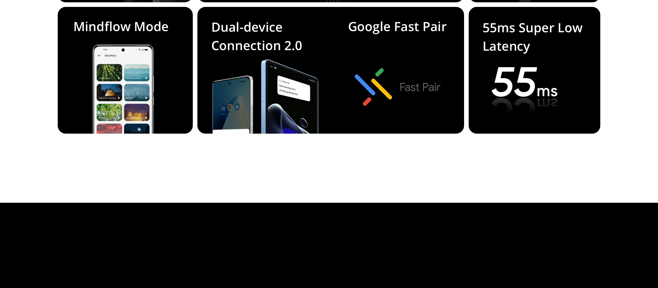 Hi-Fi Quality Dual Drivers/50dB Smart Active Noise Cancellation/360° Spatial Audio Effect/Up to 40 hours of Playback(10 mins Charge for 7 hrs Playback.)/6mm Micro-planar Tweeter/11mm Bass Driver/Personalized Audio Algorithm/Certified by Hi-Res LDAC Transmission/Dynamic Bass Boost/4000Hz Ultra-wide Band Noise Cancellation/Smart Adaptive Noise Cancellation/6-Mic Call Noise Cancellation/55ms Super Low Latency/Dual-device Connection 2.0/Mindflow mode/Google Fast Pair/Smart Touch Controls/IP55 WaterResistance