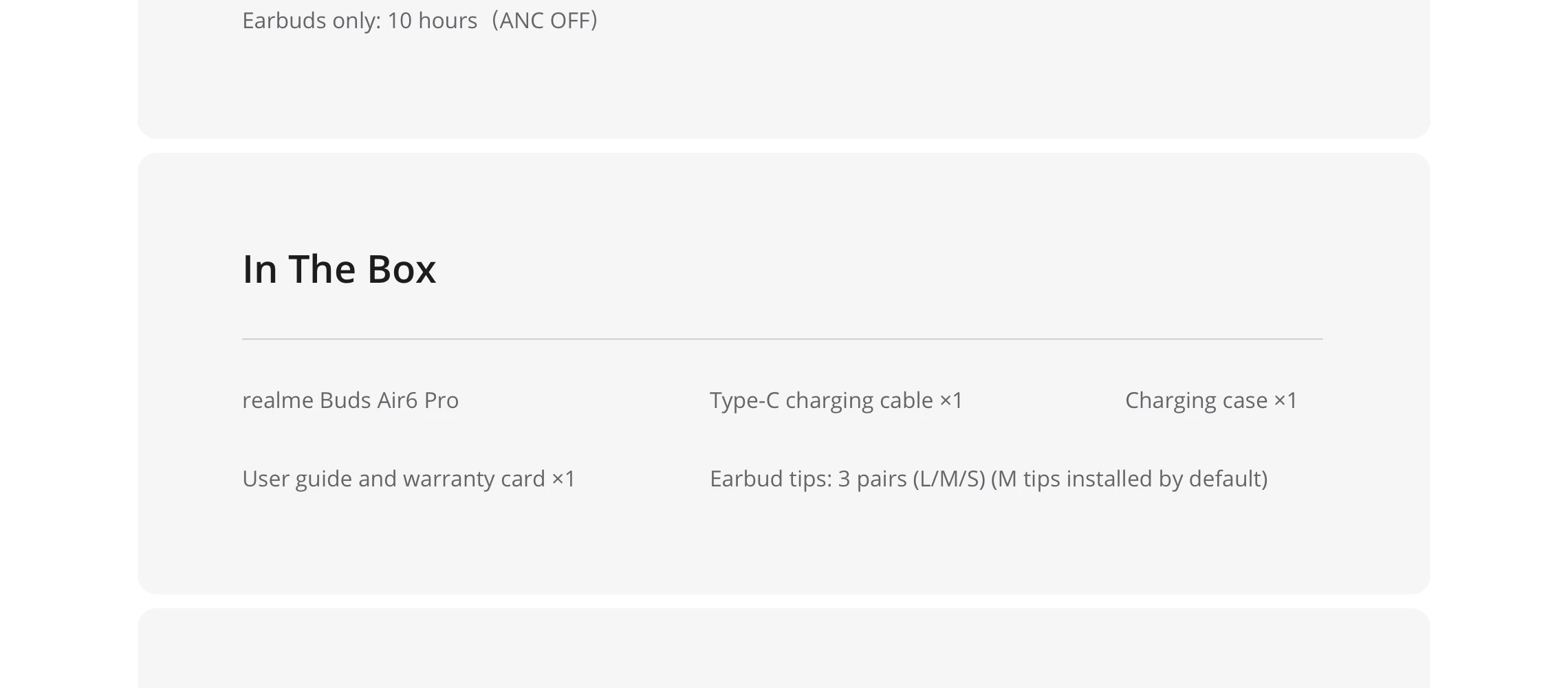 Earbud tips: 3 pairs (L/M/S) (M tips installed by default)