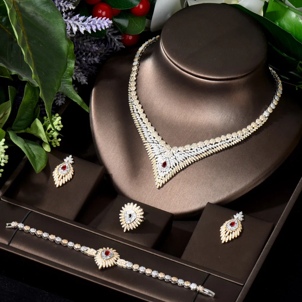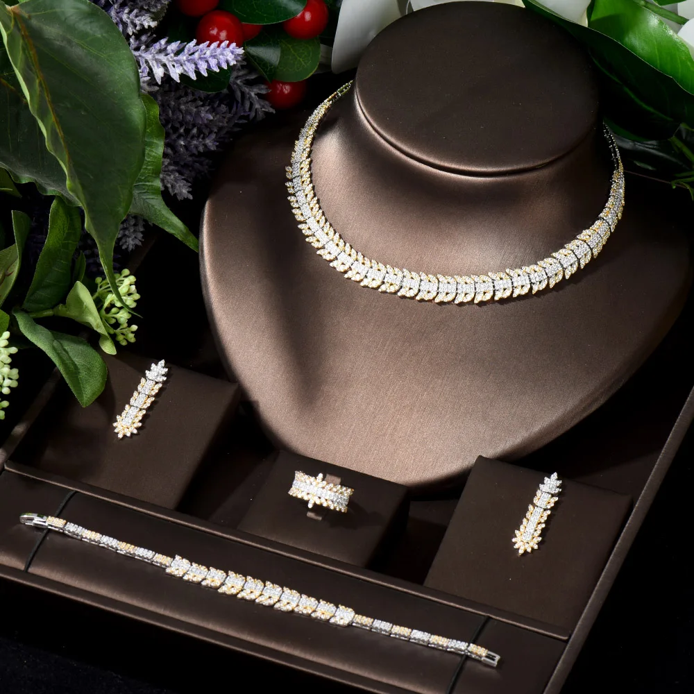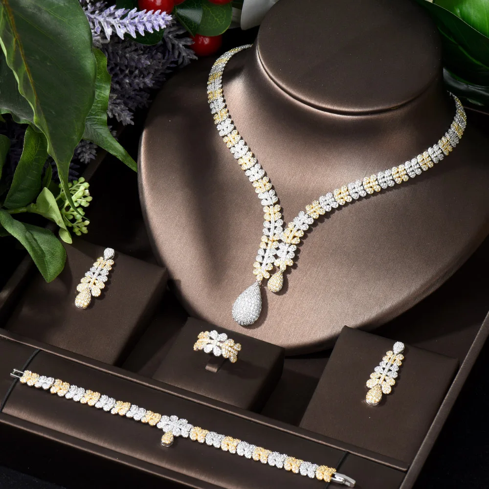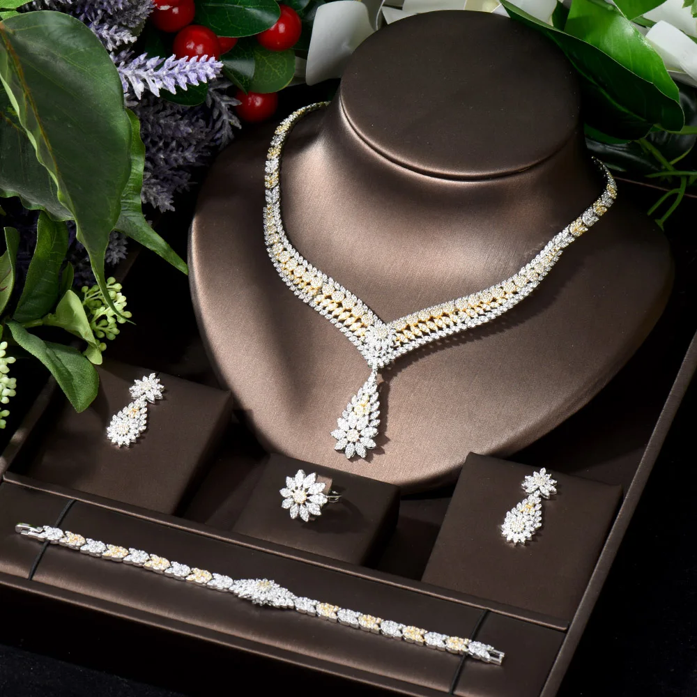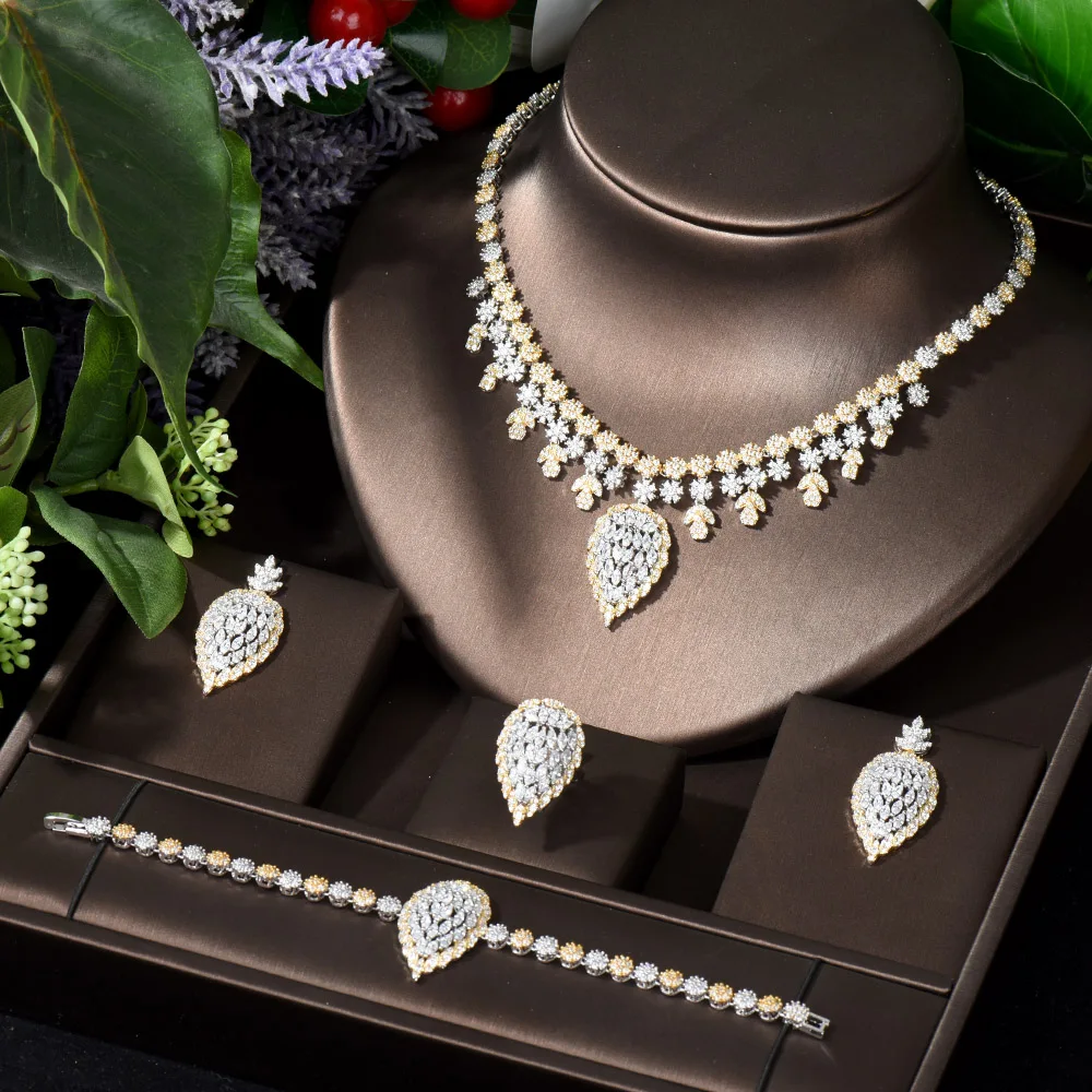 HIBRIDE التخليص السعر خمر دبي 2 نغمات طقم مجوهرات للنساء زركون أقراط للعروسة وقلادة مجموعة بيجو