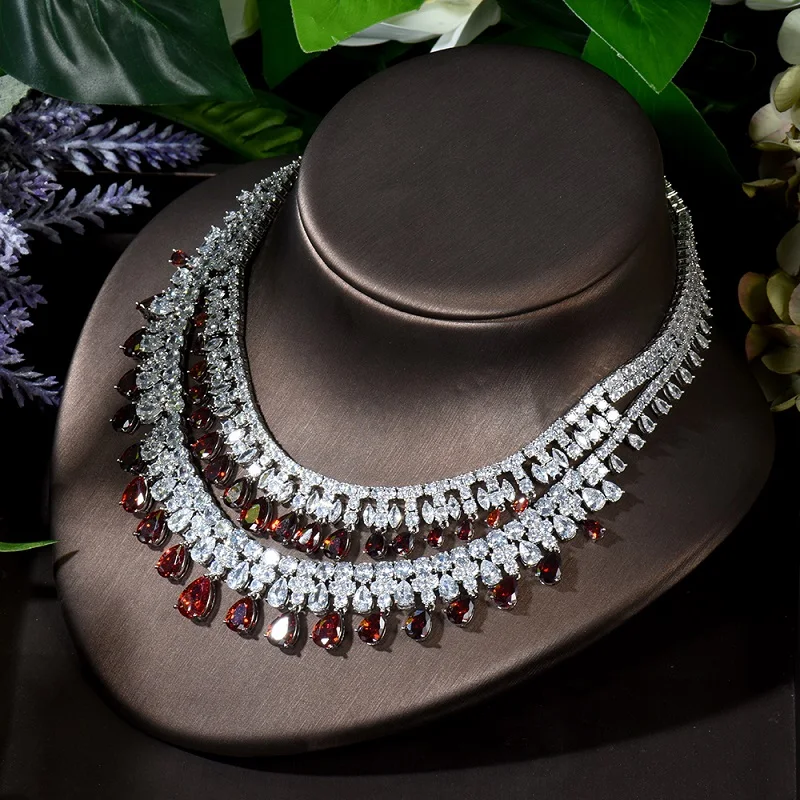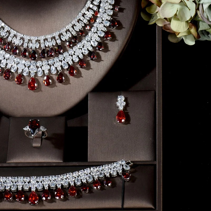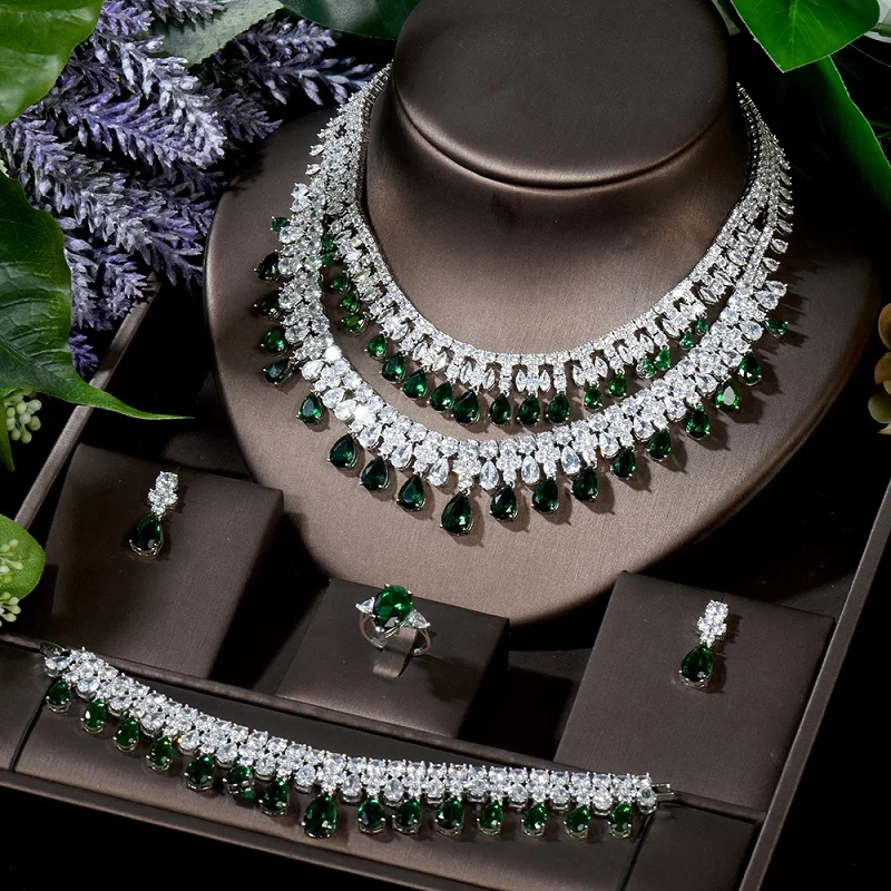 HIBRIDE خمر الزفاف حزب مجوهرات مجموعة قطرة الماء الزركون قلادة القرط سوار وخاتم مجموعة للنساء الزفاف هدية N-866