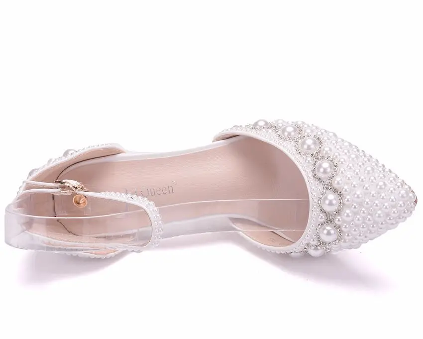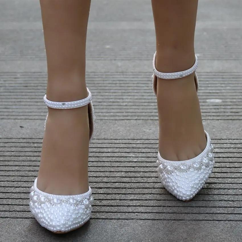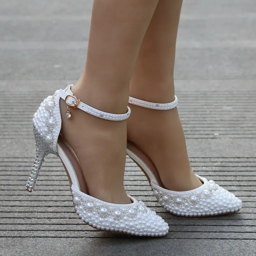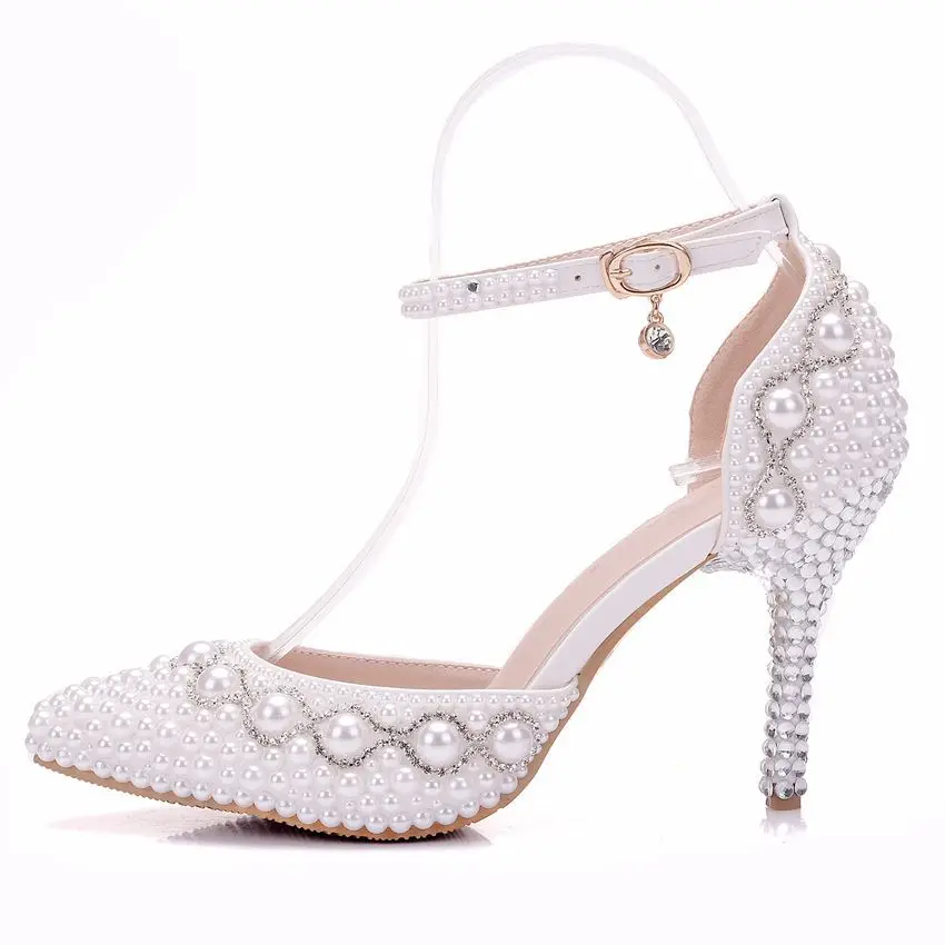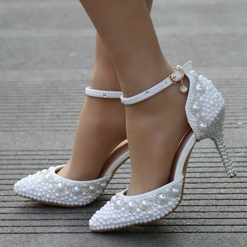 HOT البيع أحذية النساء الموضة مضخات مشبك اللؤلؤ أشار تو الكعوب رقيقة 9.5 سنتيمتر مثير حفلة موسيقية الزفاف عالية الكعب أحذية النساء