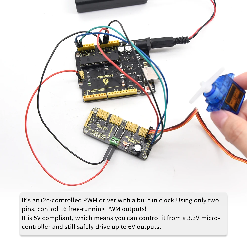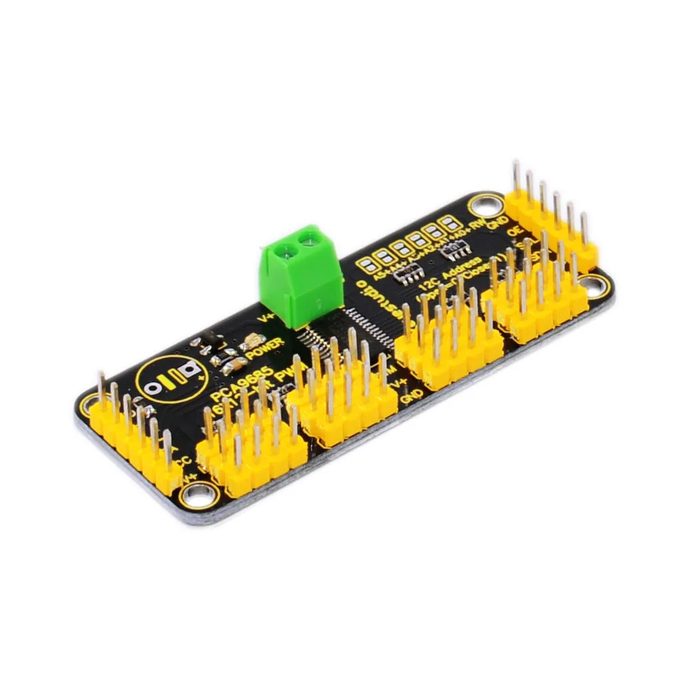 When we saw this chip, we quickly realized what an excellent add-on this would be. Using only two pins, control 16 free-running PWM outputs! You can even chain up 62 breakouts to control up to 992 PWM outputs (which we would really like to see since it would be glorious).