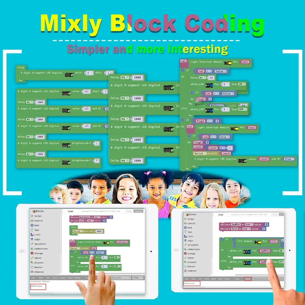 This kit includes everything you need to complete Mixly projects that will teach you how to control and read external sensors and displays, sound control, learn Mixly Blocks programming, and much more.