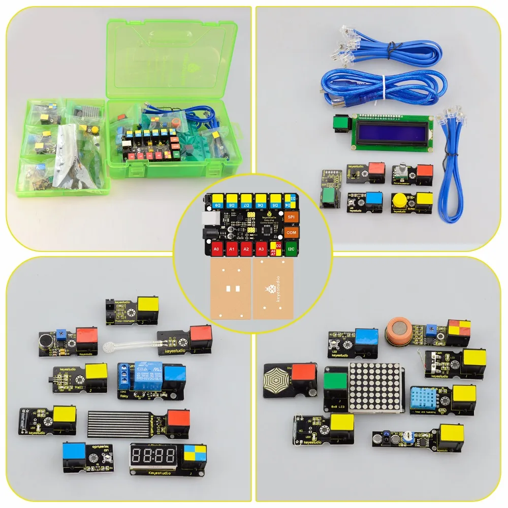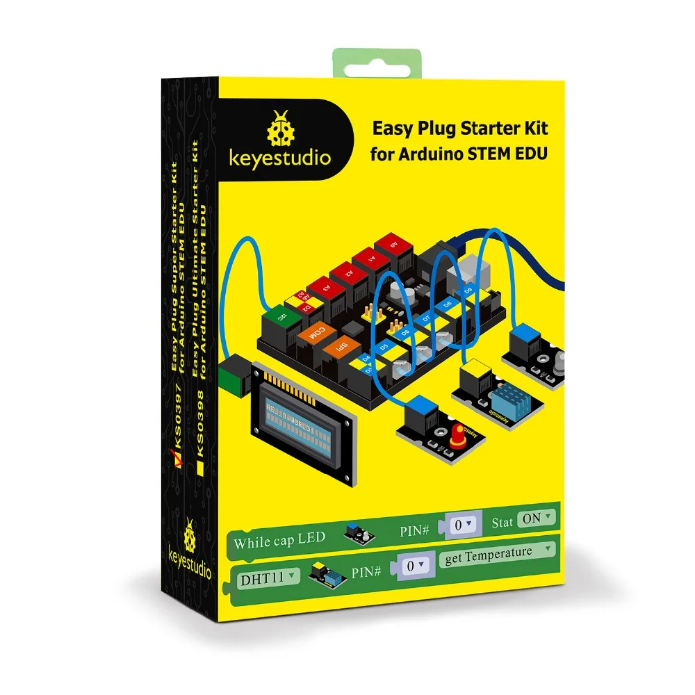 The keyestudio EASY PLUG ultimate starter kit is based on Mixly blocks coding, very easy to use and flexible.
