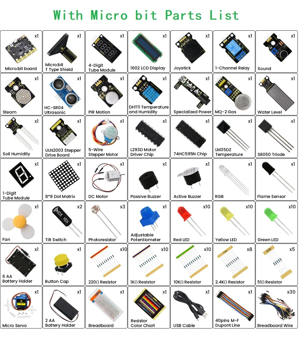 In light of learning Micro:bit knowledge, we launch this kit for starters. Moreover, the commonly used resistors, LEDs, digital tube, sensors and modules are included in the kit as well. A numerous of experiment courses are provided for you, which will assist to have knowledge of Micro:bit.