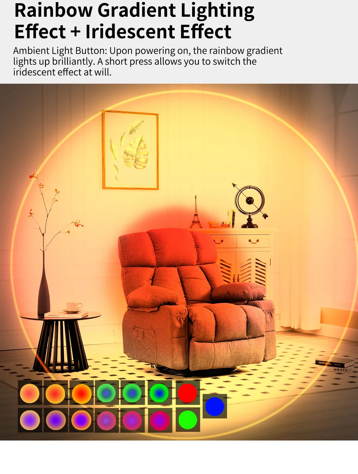 Light color: Warm light/Color light (RGB gradient, customizable monochrome)