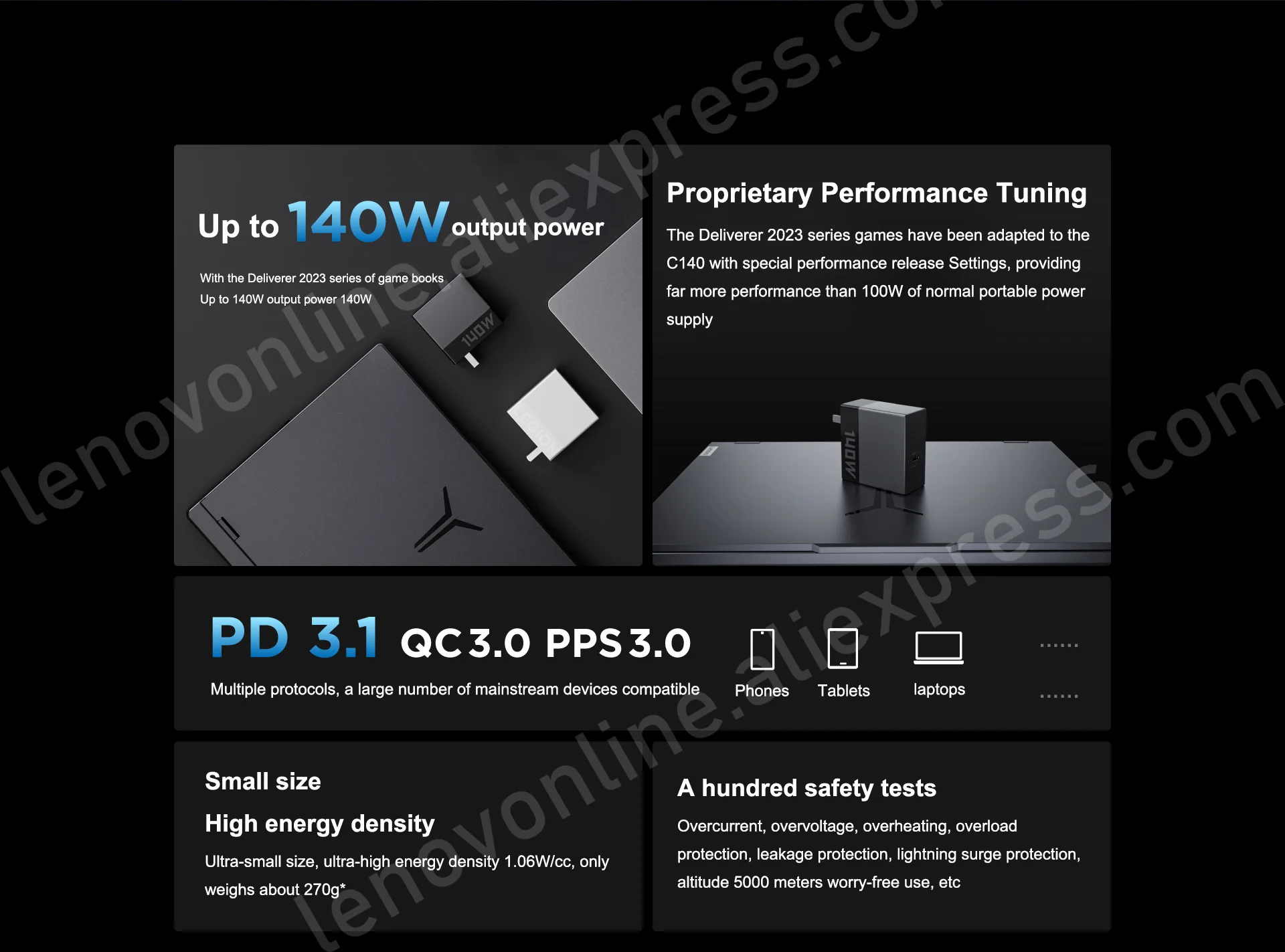 The C140W adapter supports the maximum charging power of USB-C PD ports of Lenovo Xiaoxin and YOGA 22 and earlier series