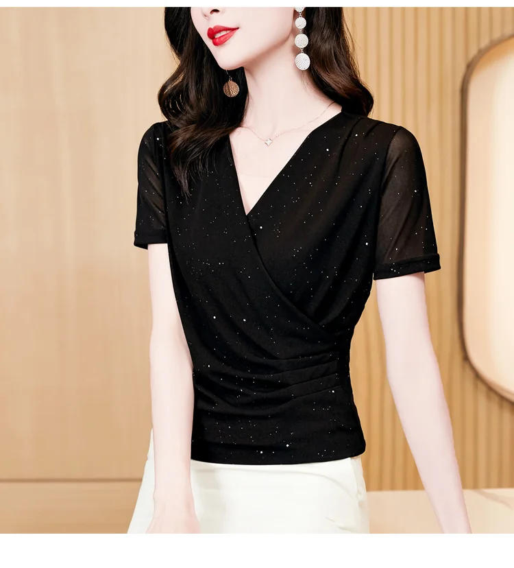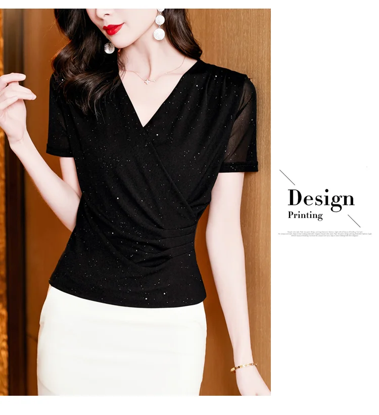 M-3XL شبكة التي شيرت المرأة الصيف قصيرة الأكمام عبرت الخامس الرقبة تي شيرت سيدة أنيقة عالية بسط بلايز تيز للإناث