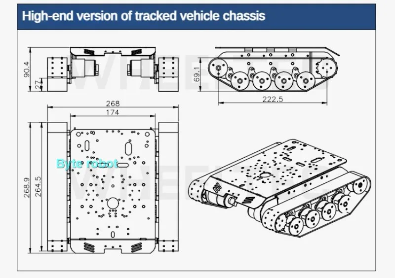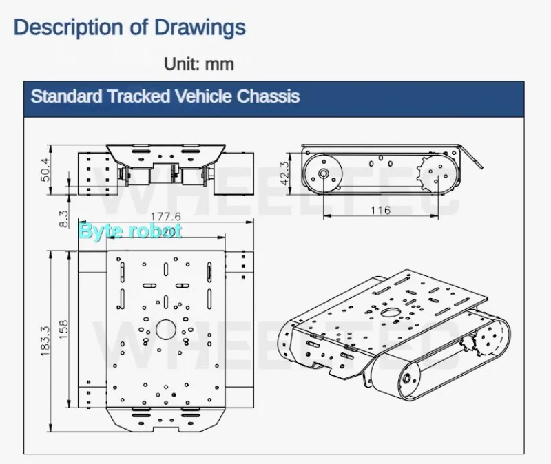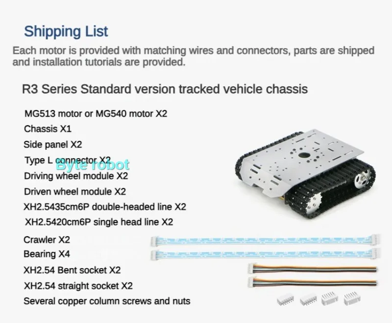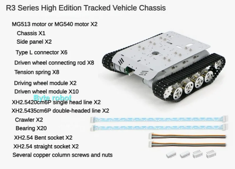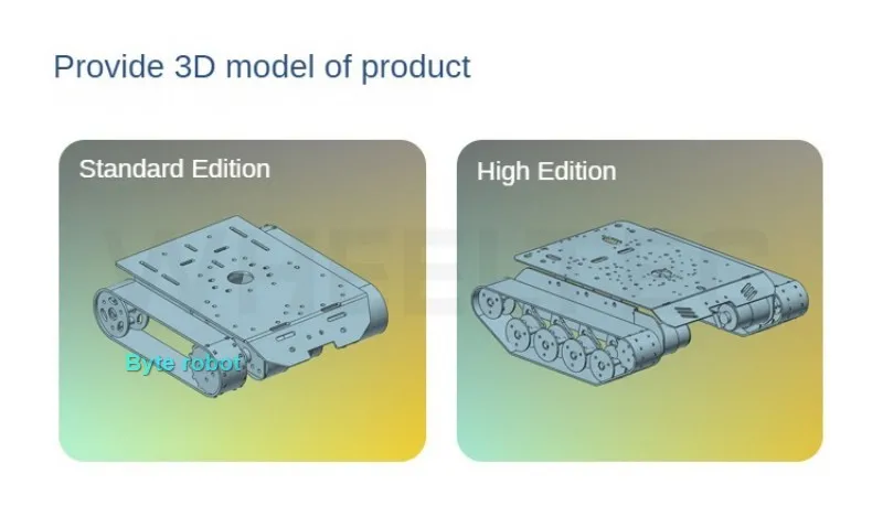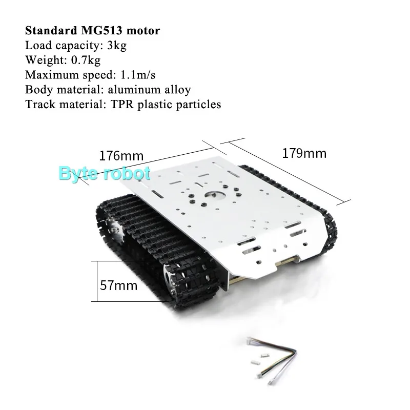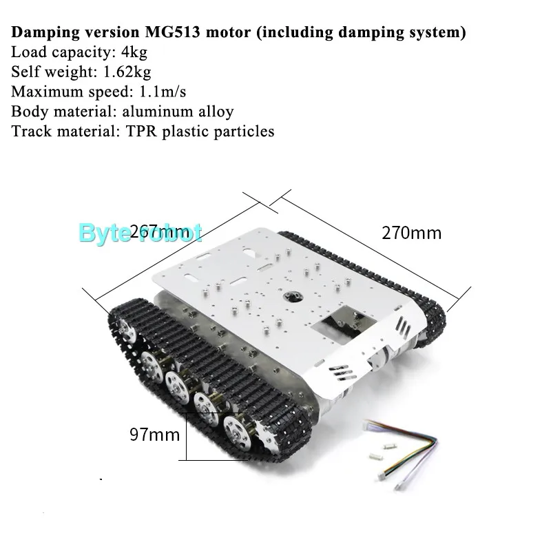 The chassis of this tracked vehicle is exquisite and beautiful in appearance. The chassis bracket and wheels are all metal, solid documents, and two geared motors with encoders provide power. It has the characteristics of forward and backward, left turn and right turn, circle on the spot, and flexible turning.