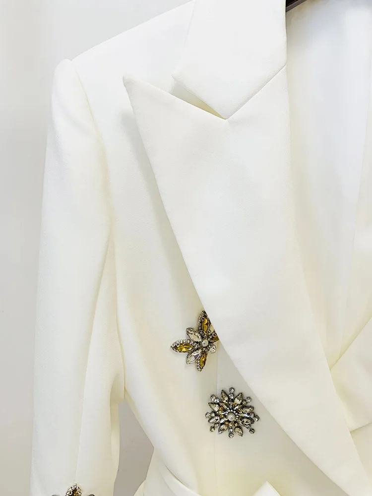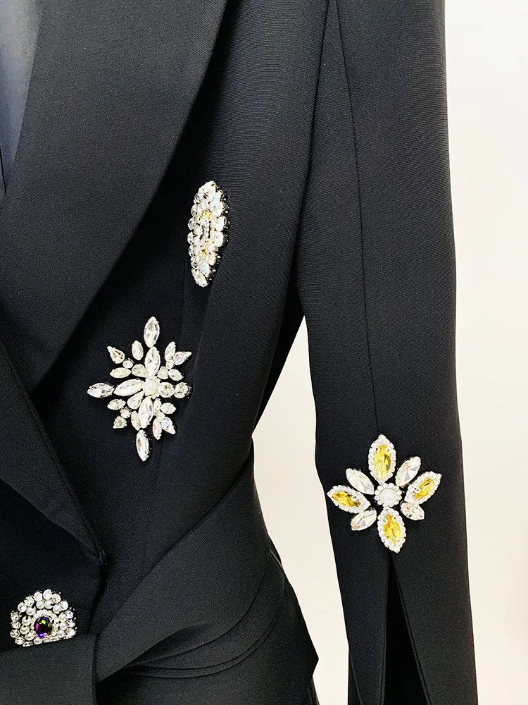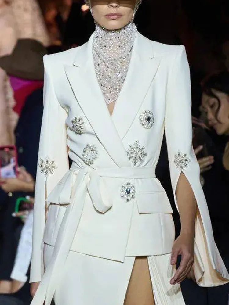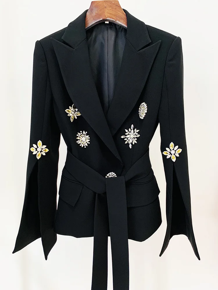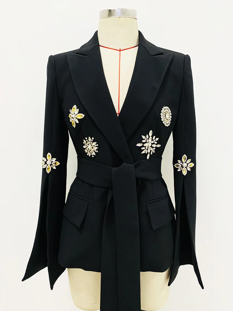 Newest Fashion 2024 Designer Jacket Women’s Slit Sleeve Rhinestone Diamonds Beading Belted Blazer