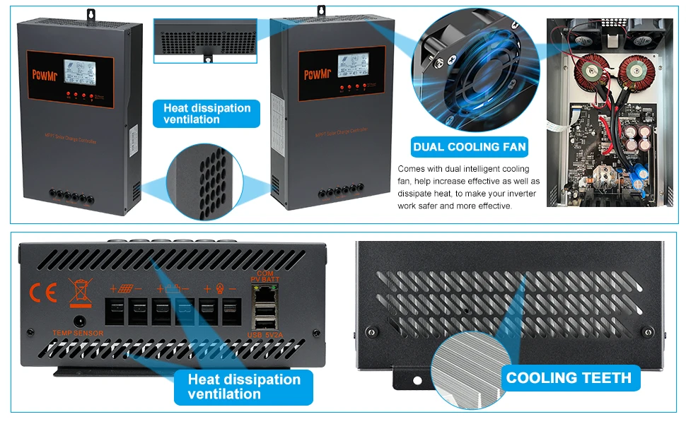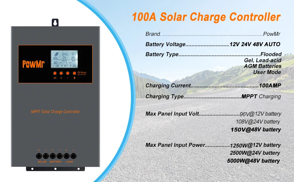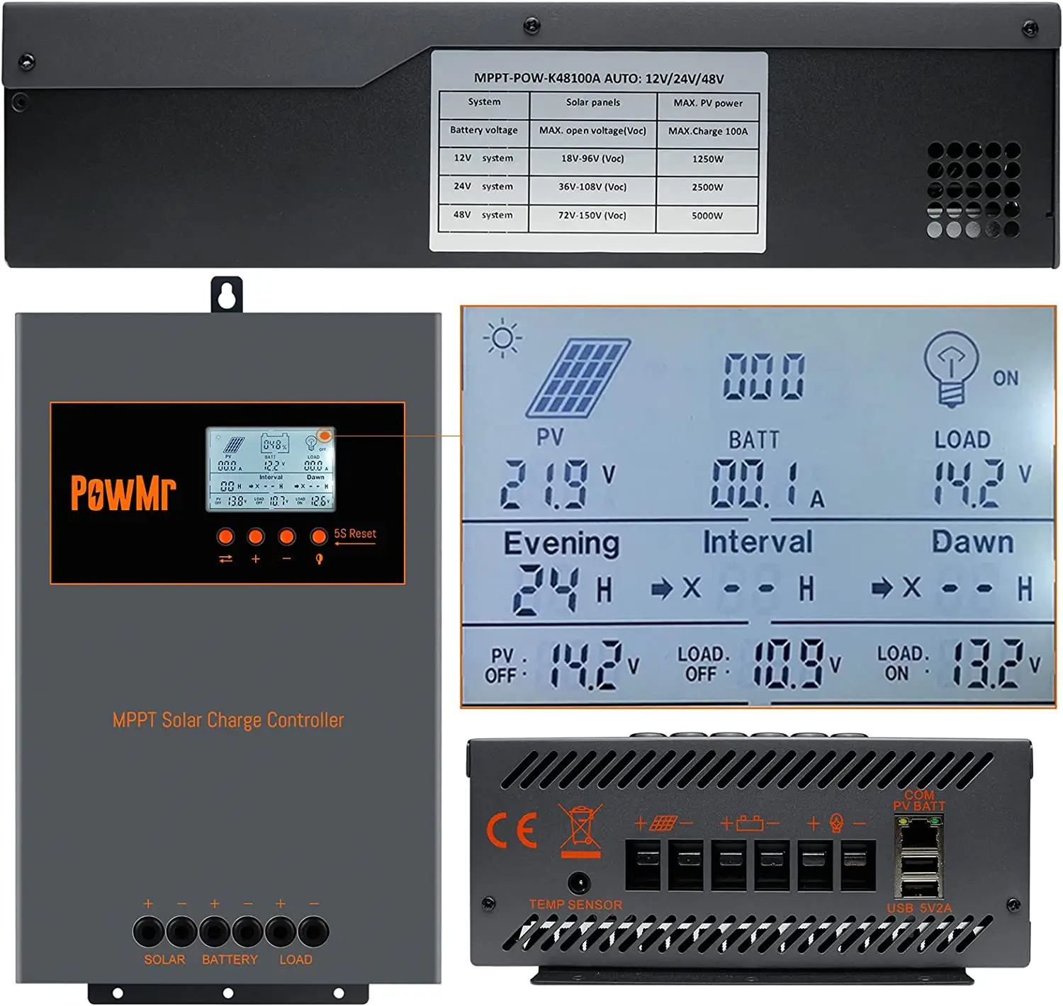 PowMr MPPT 100A Solar Charger Controller 12V 24V 48V Auto Solar Panel Regulator MAX PV 144V 5000W Solar Power Input For Battery