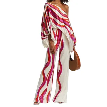 Yeezzi 2024 New Female Elegant Two Pieces Sets Fashion Striped Puff Sleeves Off-the-shoulder Tops & High Waist Wide Leg Pants