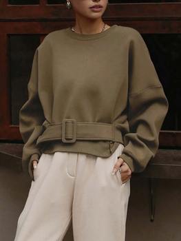 Yeezzi 2025 New Spring Women’s Fashion Belt Buckle Hoodies Tops Loose Long Sleeves Solid Color Round-Neck Casual Sweatshirts