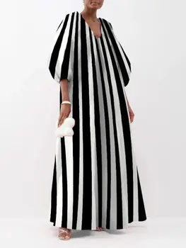 Freeacy 2024 Fashion Women’s Dress Contrast Color Striped V-neck Puff Sleeves Loose Fit Maxi Dress Stylish Party Dresses