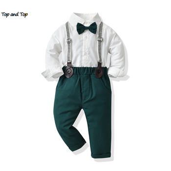 توب و توب الأطفال الأولاد مجموعة ملابس رسمية طفل صبي شهم كم طويل ابيض قميص + الحمالات السراويل ملابس وتتسابق