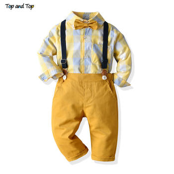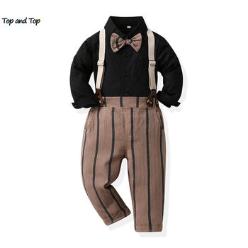 بلوزات وأعلى موضة جديدة للأطفال الأولاد جنتلمان مجموعة ملابس طويلة الأكمام ربطة قميص + الحمالات السراويل طفل بدلة رسمية الزي
