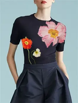 Modigirl Summer Black T-Shirts For Women Fashion Floral Printed 2025 New Round-neck Vintage Casual Short Sleeves Skinny Tops