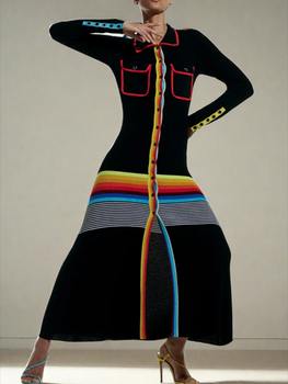Freeacy Women’s Colorful Striped Skinny Dress Lapel Neck Long Sleeves Single-breasted Ankle-Length Dress Autumn Women’s Clothing