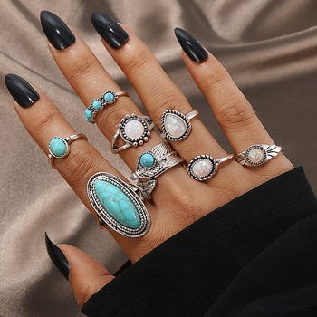 IPARAM خواتم فضية اللون خمر للنساء بيضاوي الشكل تقليد الفيروز ليف البنصر البوهيمي موضة مجوهرات العصرية هدية