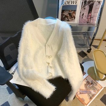 Sweet Elegant Rhinestone Bow Sweaters Women 2024 Spring Casual Wild V Neck Long Sleeve Pink Furry Mohair knitted Cardigan Jacket