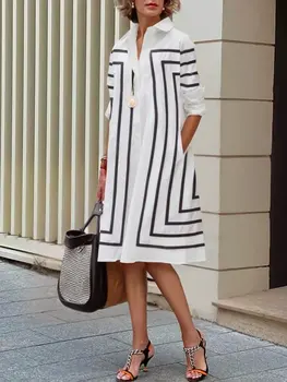 Yeezzi 2025 New Urban Women Lapel Shirts Dress Office Ladies Long Sleeves Fashion Striped Printed Buttoned H-line Midi Dresses