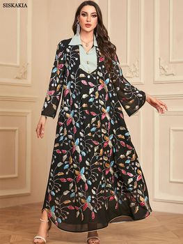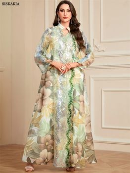 Siskakia Ramadan Dubai Floral Print Long Dress Sequins Patchwork Abayas Mesh Kebaya For Muslim Women’s Casual Loose Clothing
