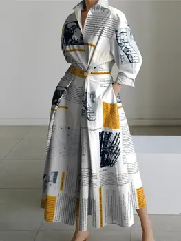 Yeezzi 2024 New Female Fashion Newspaper Printed Lapel A-Line Dress Spring Autumn Long Sleeves Casual Personality Midi Dresses