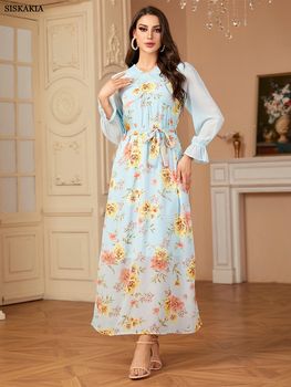 Siskakia Kaftan Abaya Dubai Floral Print Long Sleeve V-Neck Casual Loose Elegant Casual Dress with Belt Kaftan Islam Dress