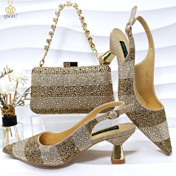 QSGFC INS 2024 ذهبي اللون أنيق للنساء بكعب أحذية و مجموعة الحقائب جوفاء الراين عالية الكعب أسافين الأحذية مطابقة حقيبة