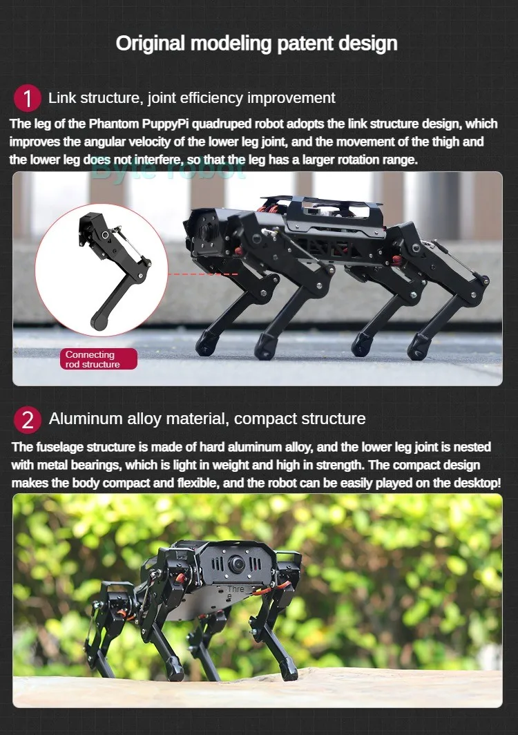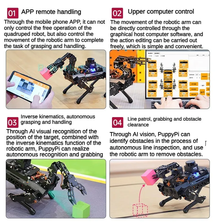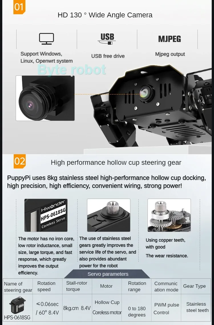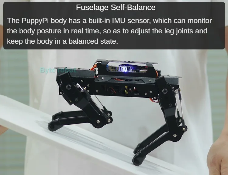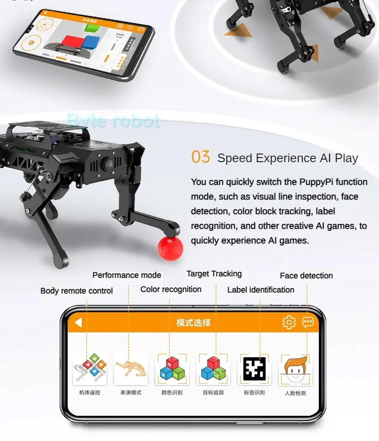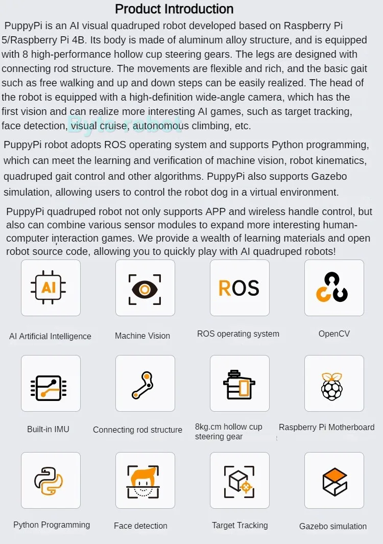 Powered by Raspberry Pi 4B or 5 4GB, 8GB PuppyPi is an AI vision quadruped robot. It is made of aluminium alloy and loaded with 8 powerful coreless servos. Linkage mechanism on its leg attributes to flexible and diverse actions and enables it to walk, step up and down stair, etc. It owns first person view for realizing more interesting AI games, including target tracking, face detection, line following, auto climbing and so on