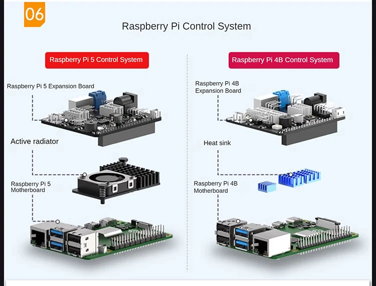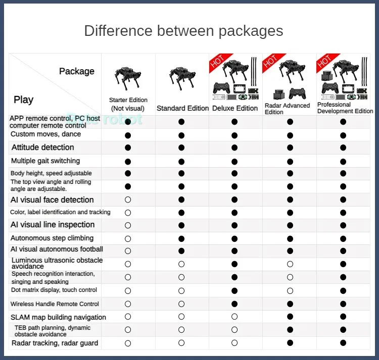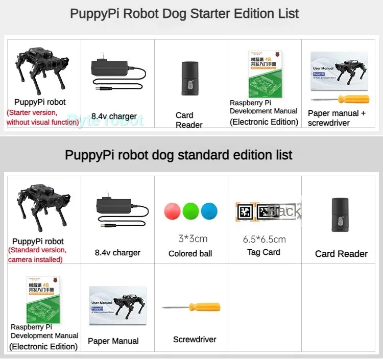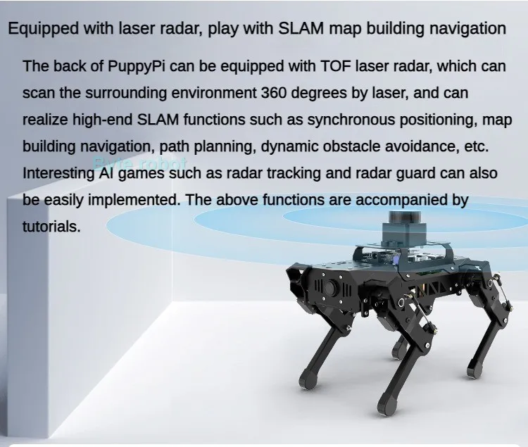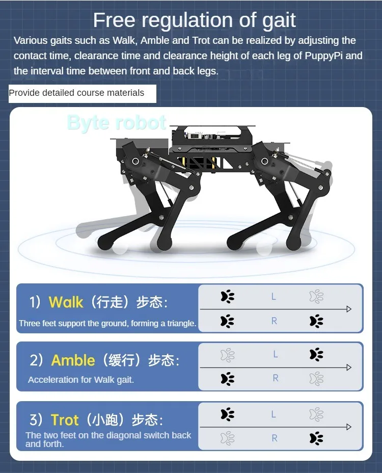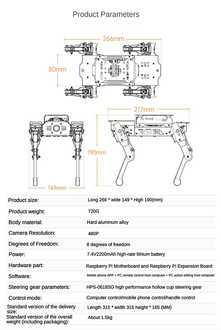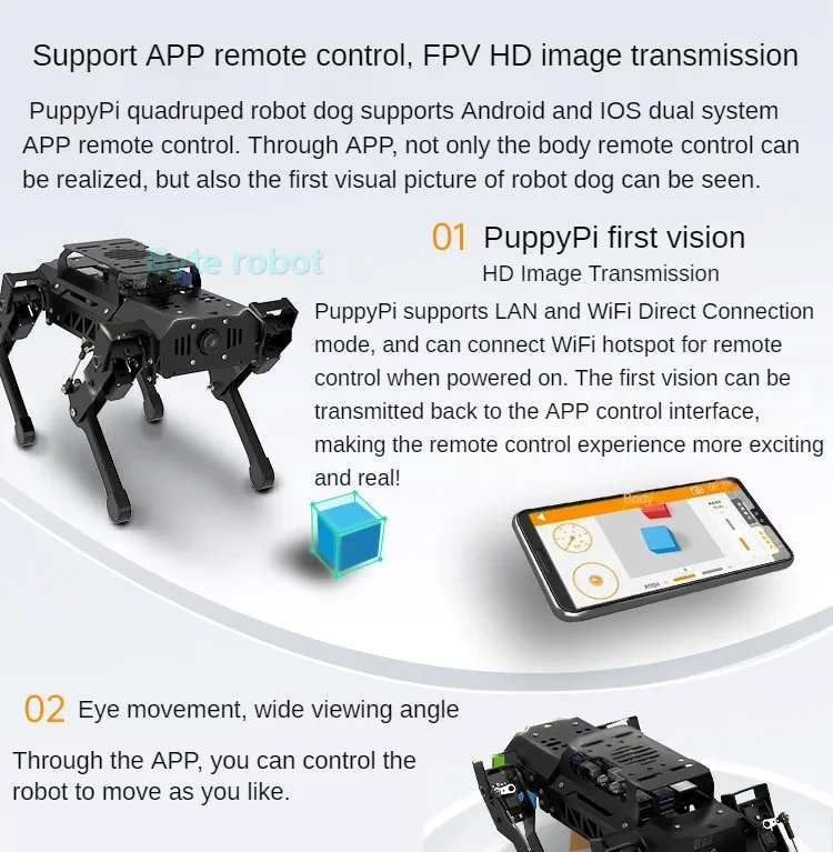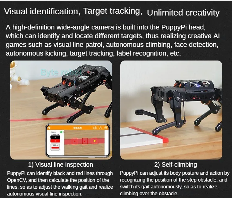 Powered by Raspberry Pi 4B or 5 4GB, 8GB PuppyPi is an AI vision quadruped robot. It is made of aluminium alloy and loaded with 8 powerful coreless servos. Linkage mechanism on its leg attributes to flexible and diverse actions and enables it to walk, step up and down stair, etc. It owns first person view for realizing more interesting AI games, including target tracking, face detection, line following, auto climbing and so on