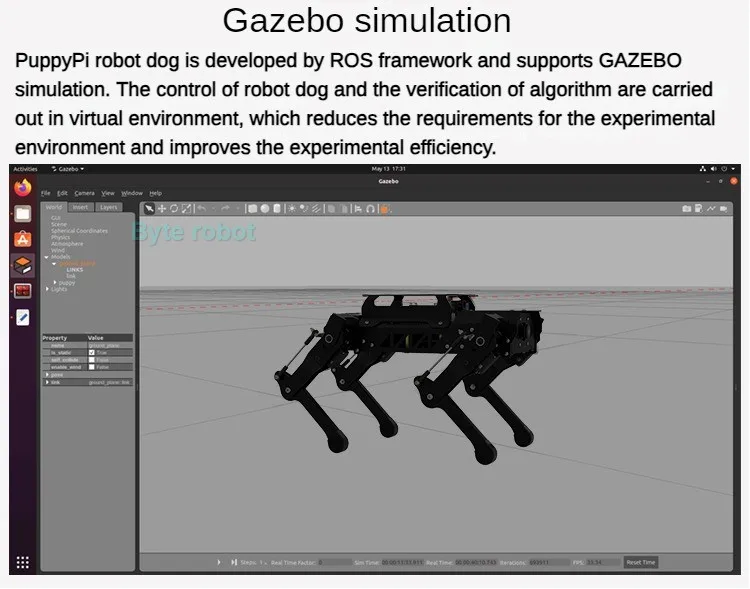 PuppyPi is based on ROS (robot operating system) and supports Gazebo simulation. It serves as a great platform for you to learn and verify machine vision, robot kinematics, quadruped gait controlling and other algorithms. Besides, ample tutorials and open-source codes will help you quickly get started!