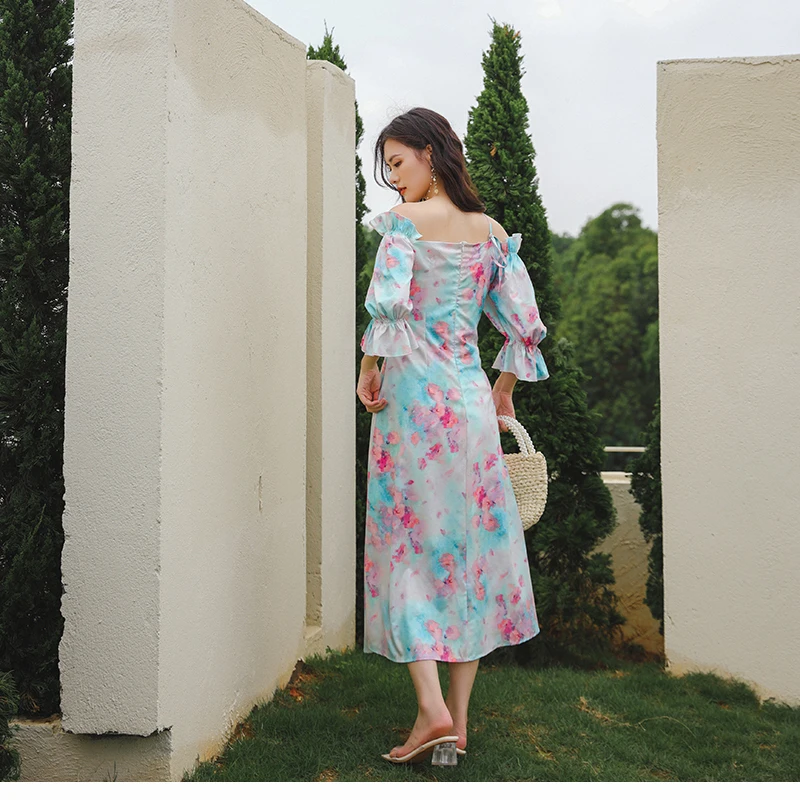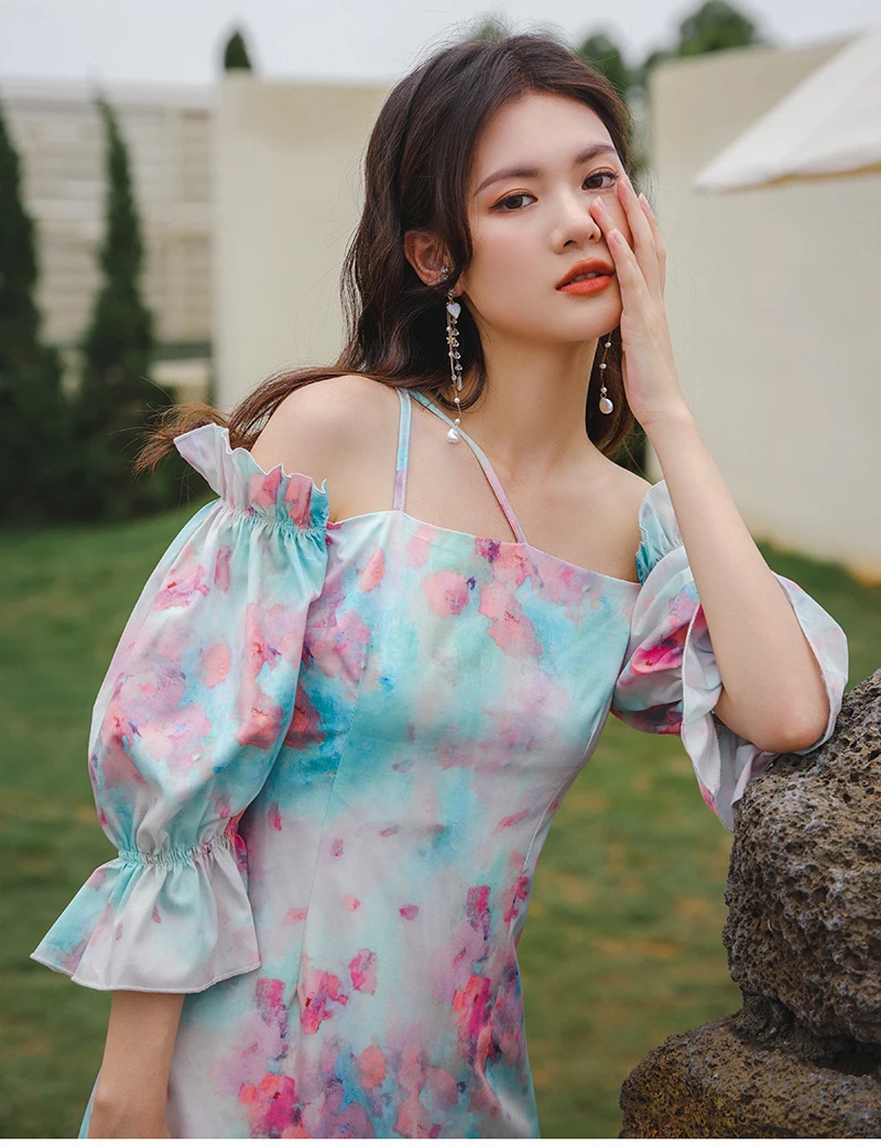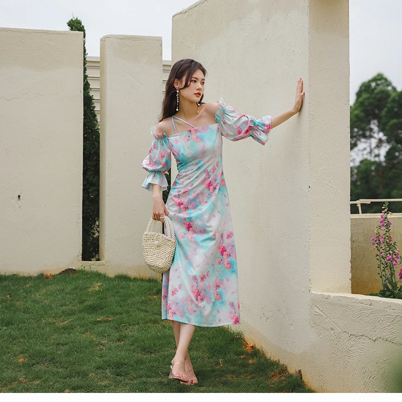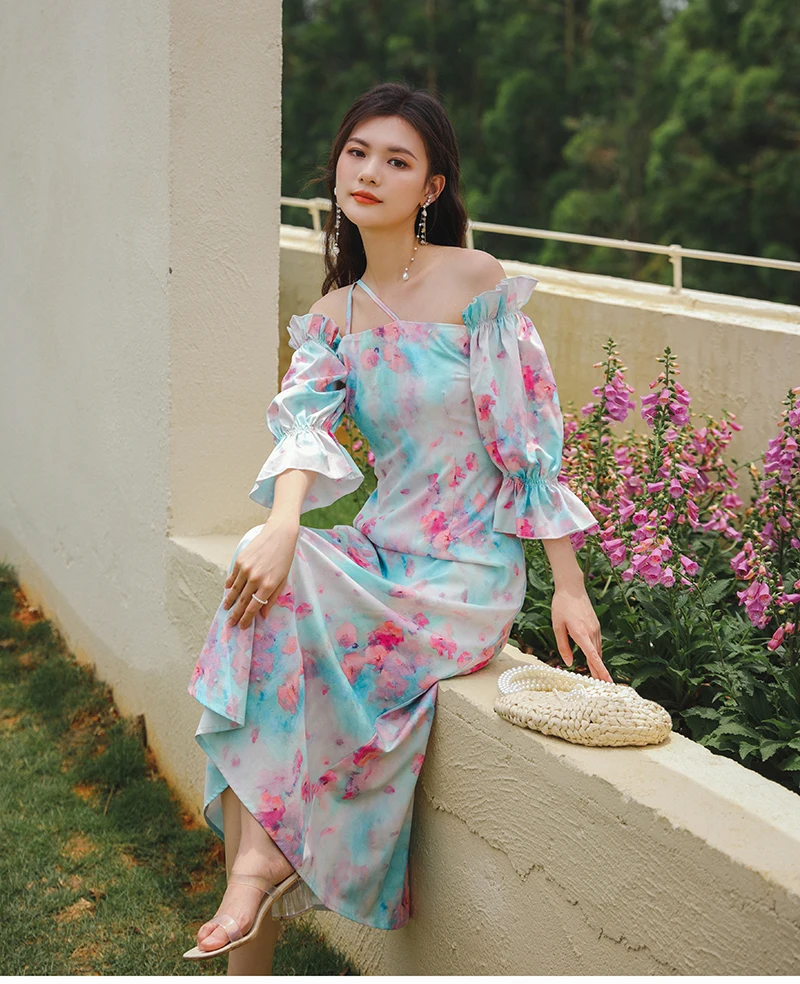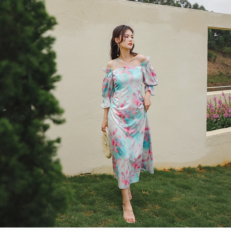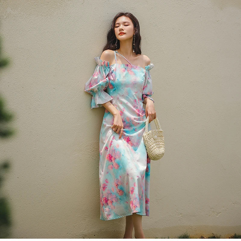 QOERLIN واحد الكتف نفخة الأكمام فستان الإناث مائل الرافعة الفرنسية قصر فستان حفلة المرأة الصيف طباعة الأزهار ميدي فستان S-XL