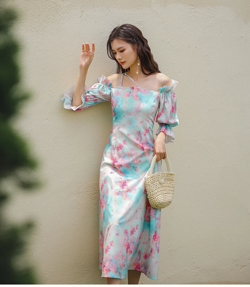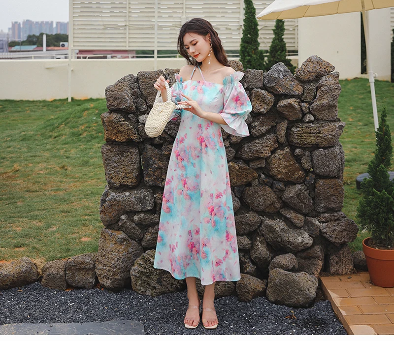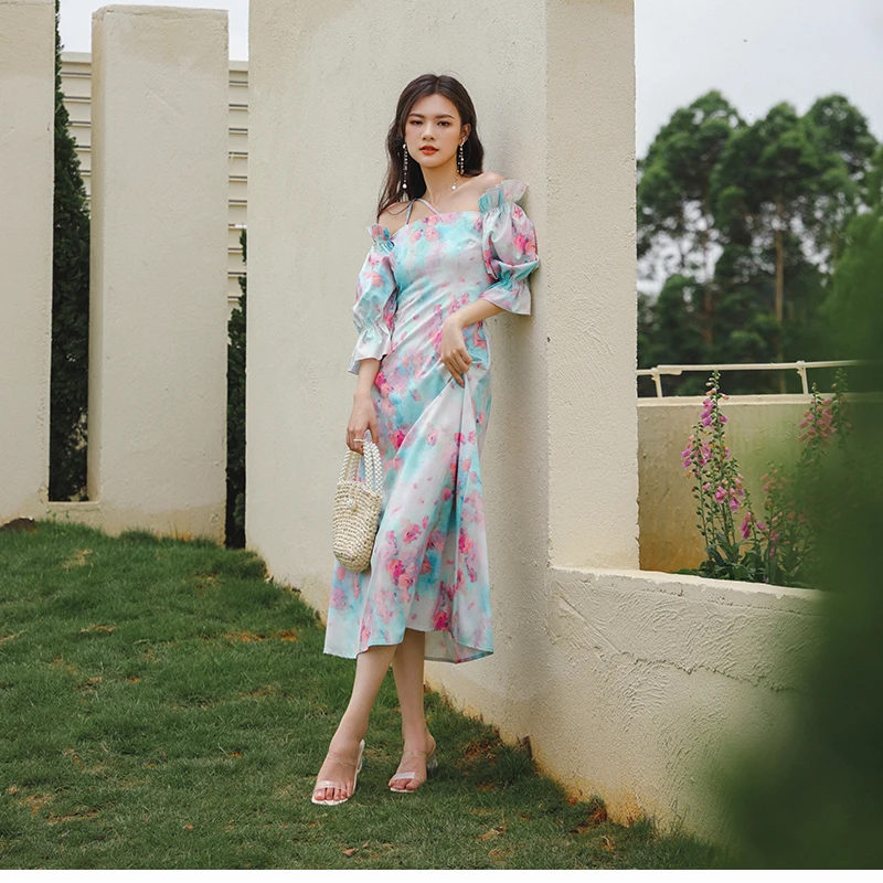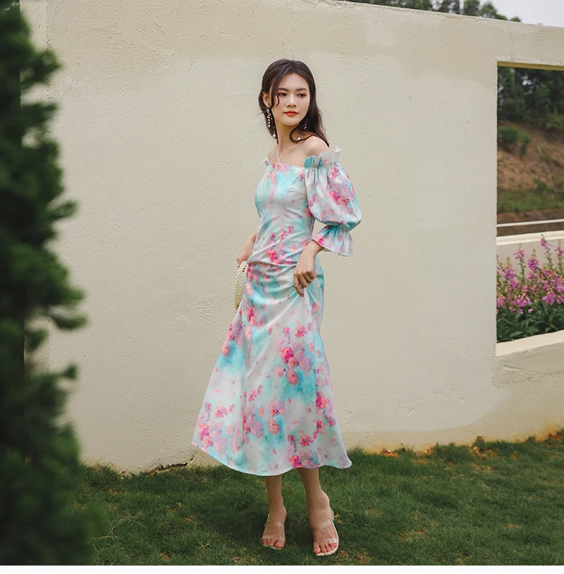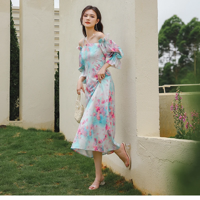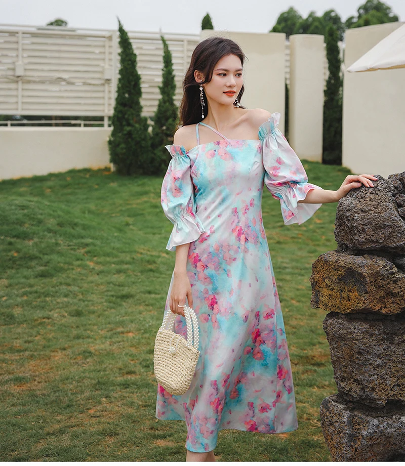 QOERLIN واحد الكتف نفخة الأكمام فستان الإناث مائل الرافعة الفرنسية قصر فستان حفلة المرأة الصيف طباعة الأزهار ميدي فستان S-XL