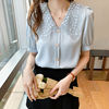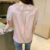 QOERLIN الساتان قميص المرأة 2021 الصيف جديد مزاجه شيك الدانتيل بدوره إلى أسفل طوق قصيرة الأكمام واحدة الصدر الوردي بلوزة S-XL