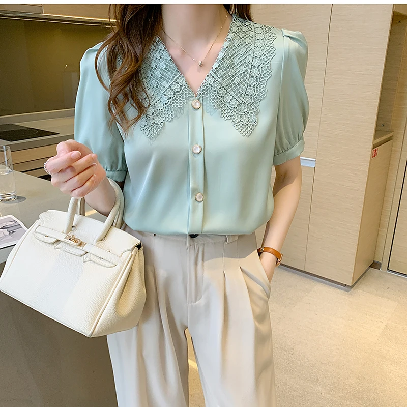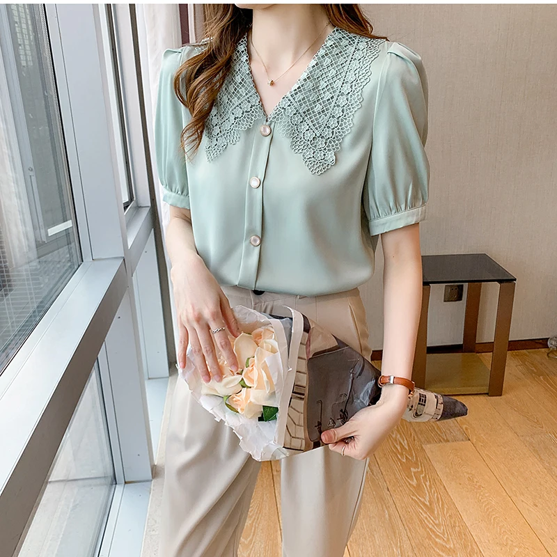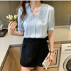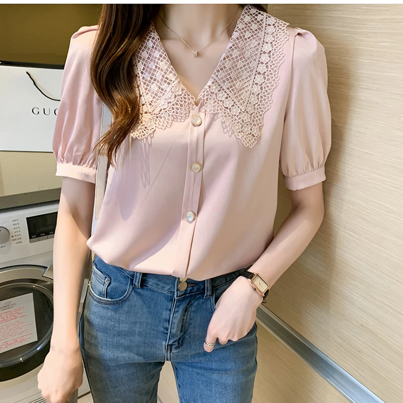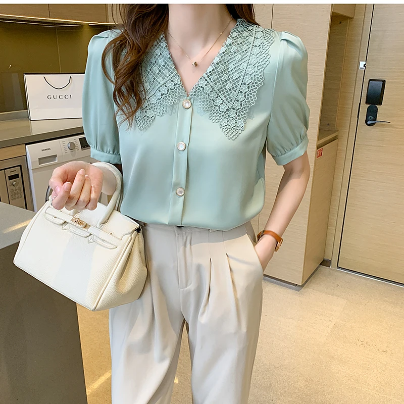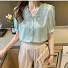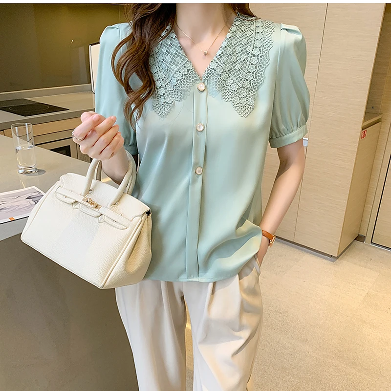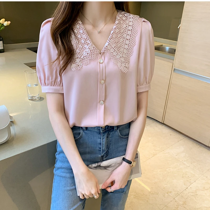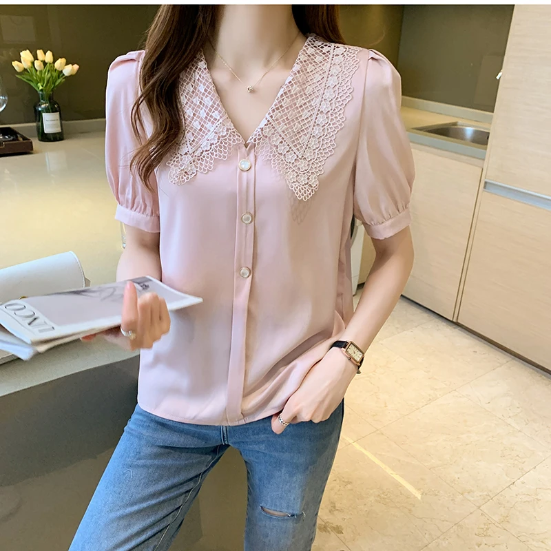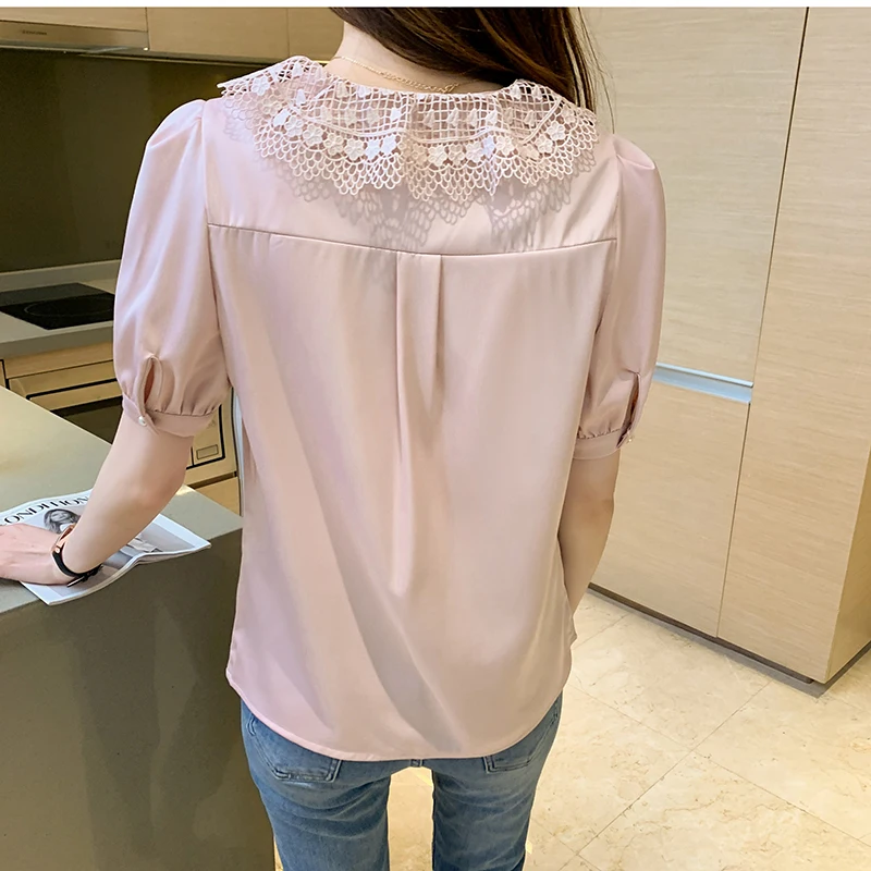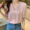 QOERLIN الساتان قميص المرأة 2021 الصيف جديد مزاجه شيك الدانتيل بدوره إلى أسفل طوق قصيرة الأكمام واحدة الصدر الوردي بلوزة S-XL