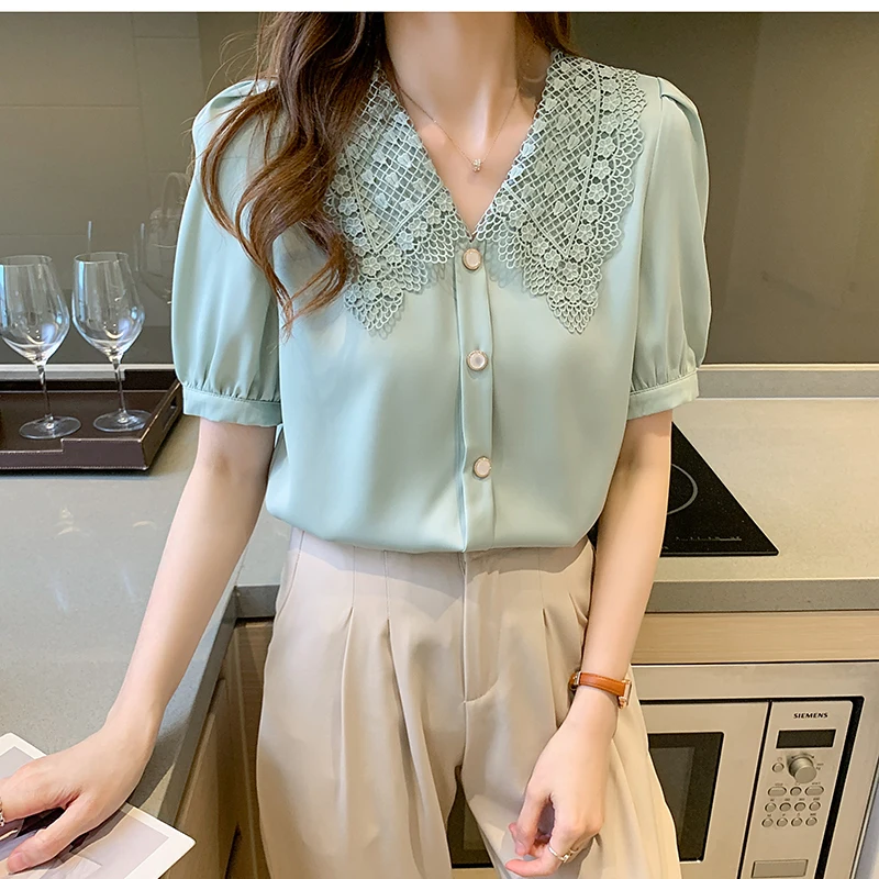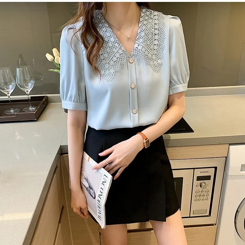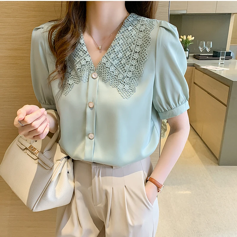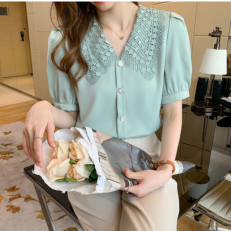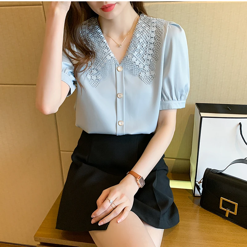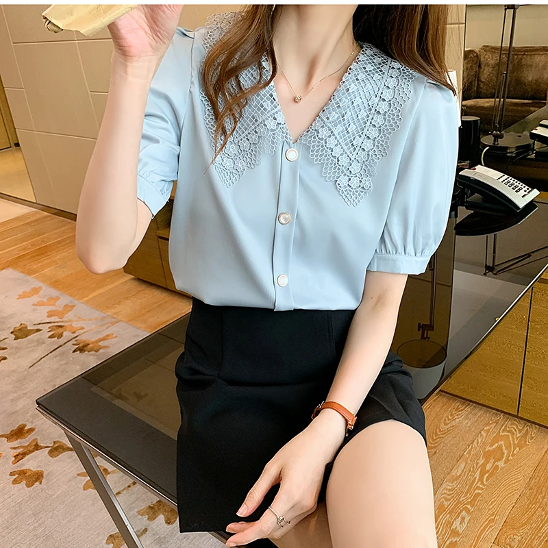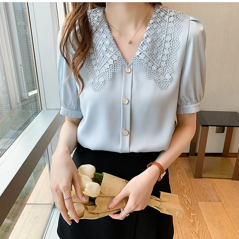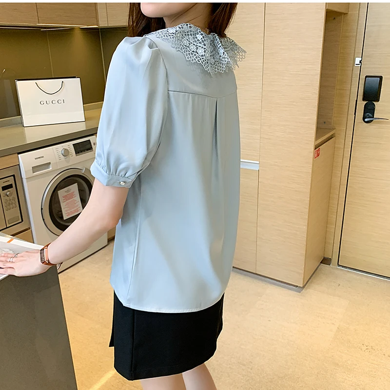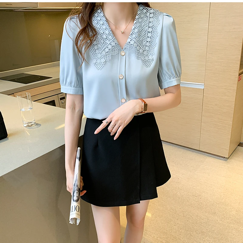 QOERLIN الساتان قميص المرأة 2021 الصيف جديد مزاجه شيك الدانتيل بدوره إلى أسفل طوق قصيرة الأكمام واحدة الصدر الوردي بلوزة S-XL