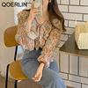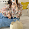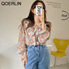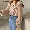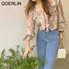 QOERLIN الكورية الحلو السيدات أنيقة الأزهار تكدرت الدانتيل متابعة القمصان مطوية مضيئة كم واحدة الصدر زر بلوزة