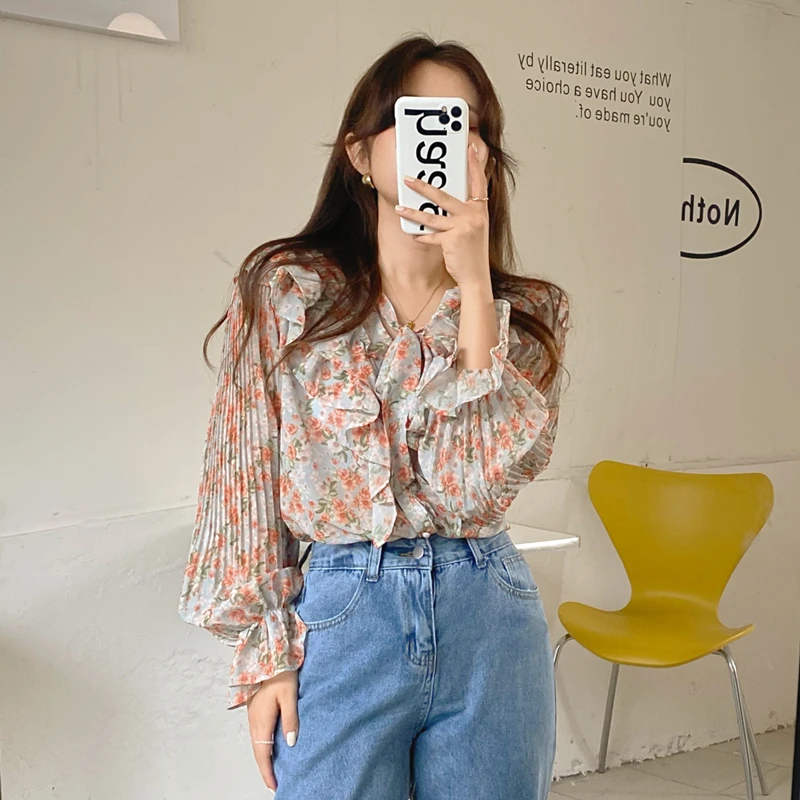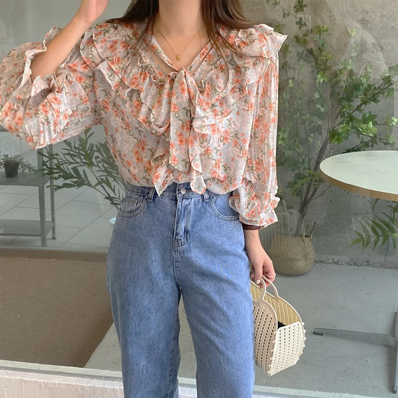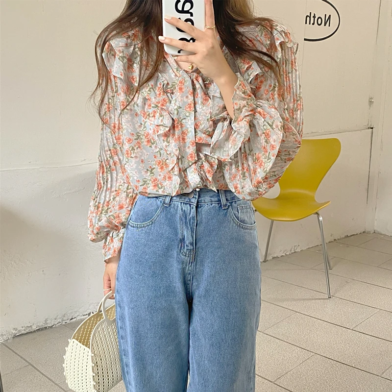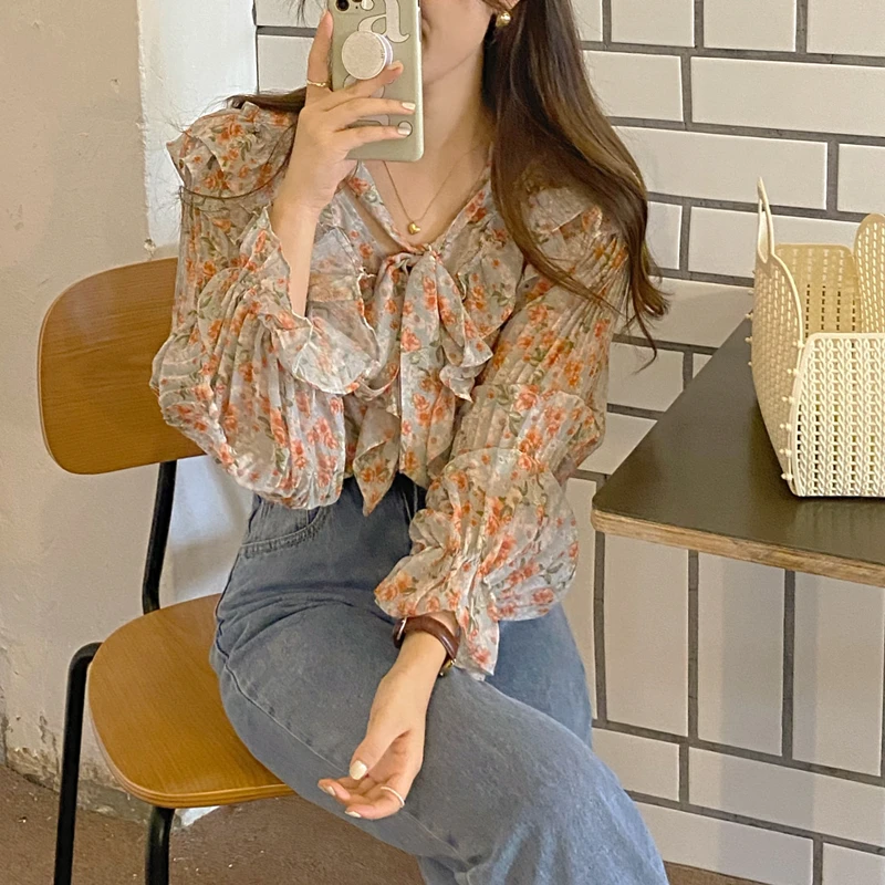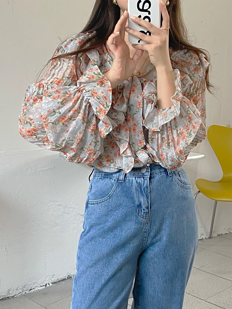 QOERLIN الكورية الحلو السيدات أنيقة الأزهار تكدرت الدانتيل متابعة القمصان مطوية مضيئة كم واحدة الصدر زر بلوزة
