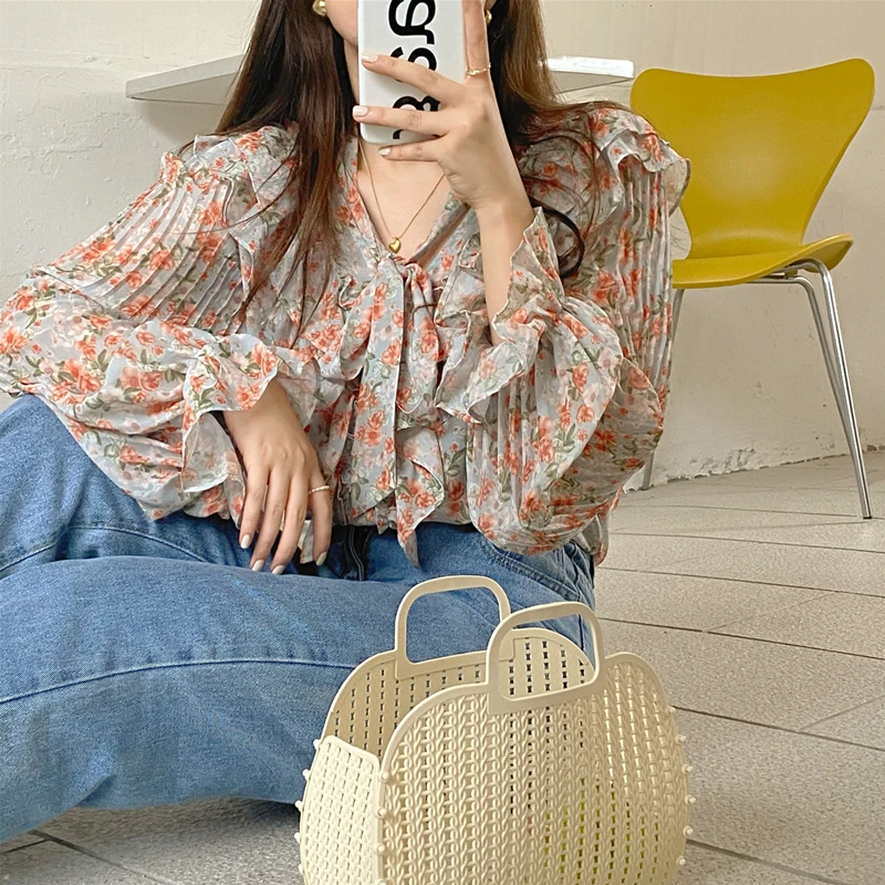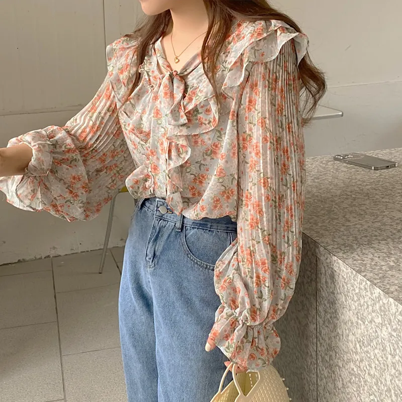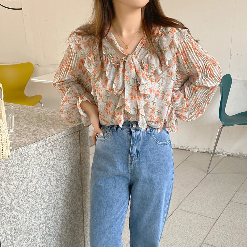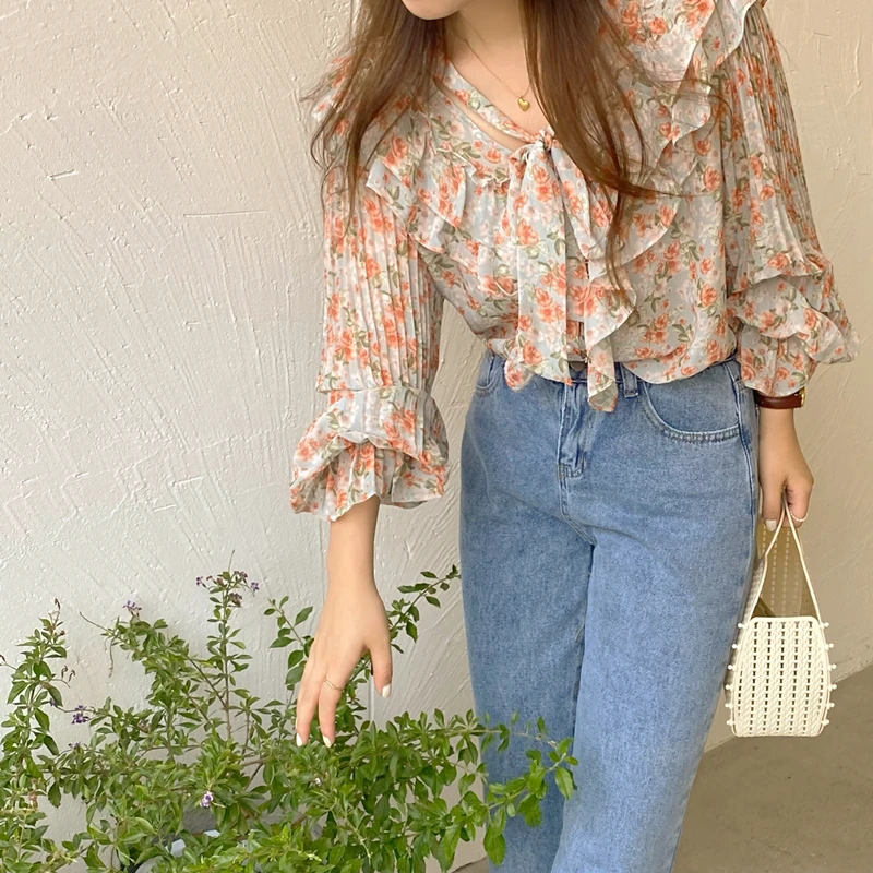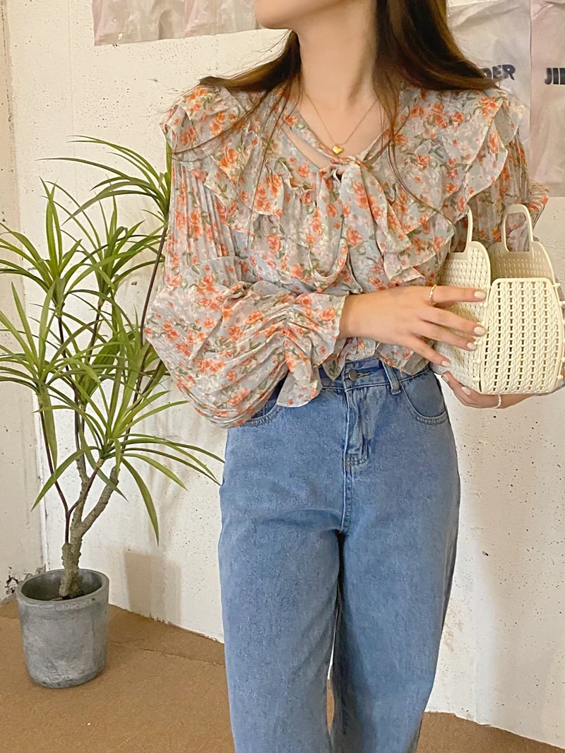 QOERLIN الكورية الحلو السيدات أنيقة الأزهار تكدرت الدانتيل متابعة القمصان مطوية مضيئة كم واحدة الصدر زر بلوزة