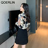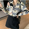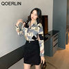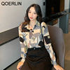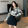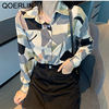 QOERLIN الكورية المرأة طويلة الأكمام الأزهار قميص الرجعية هندسية قميص بلوزة الإناث بدوره إلى أسفل طوق زر حتى